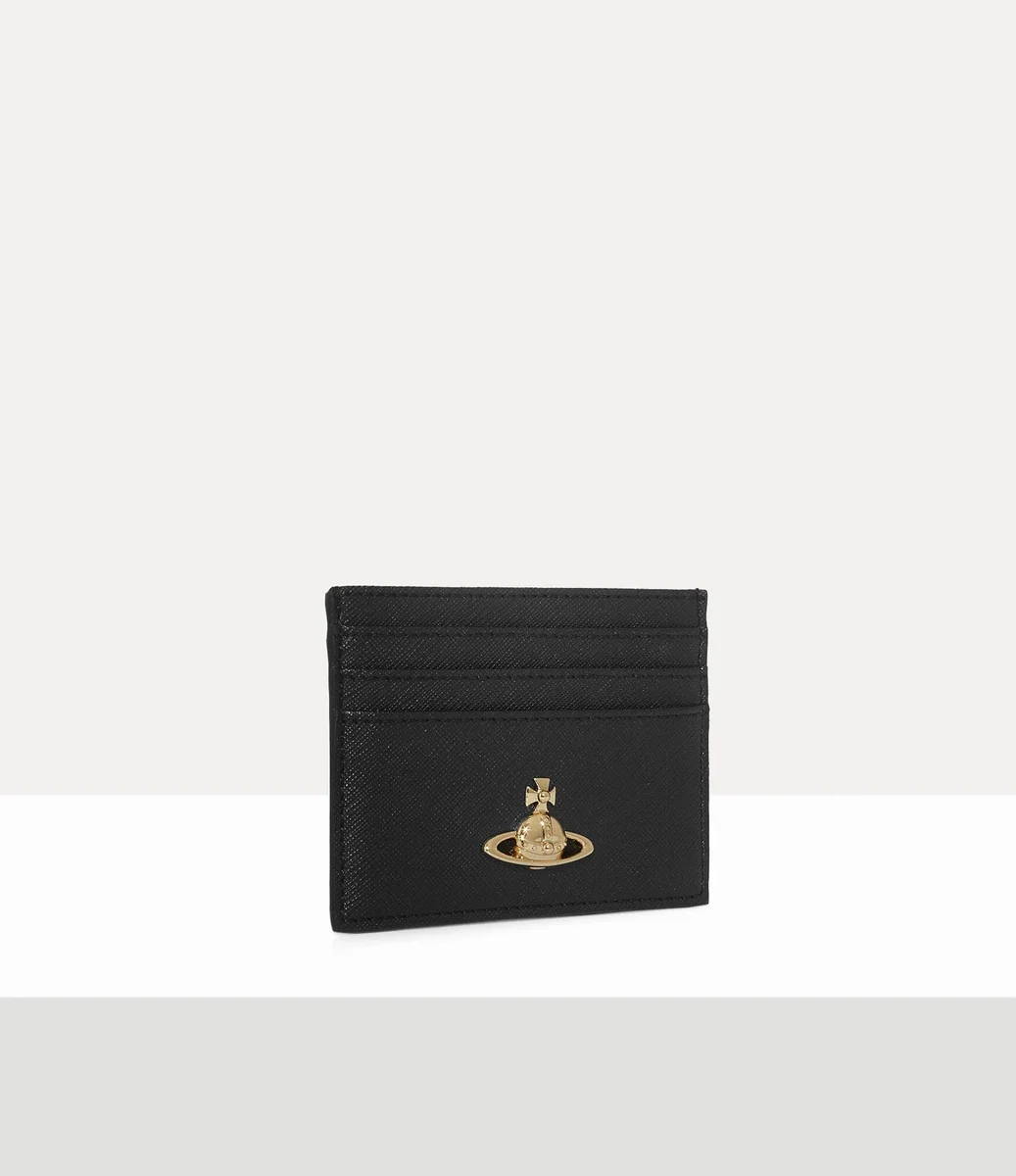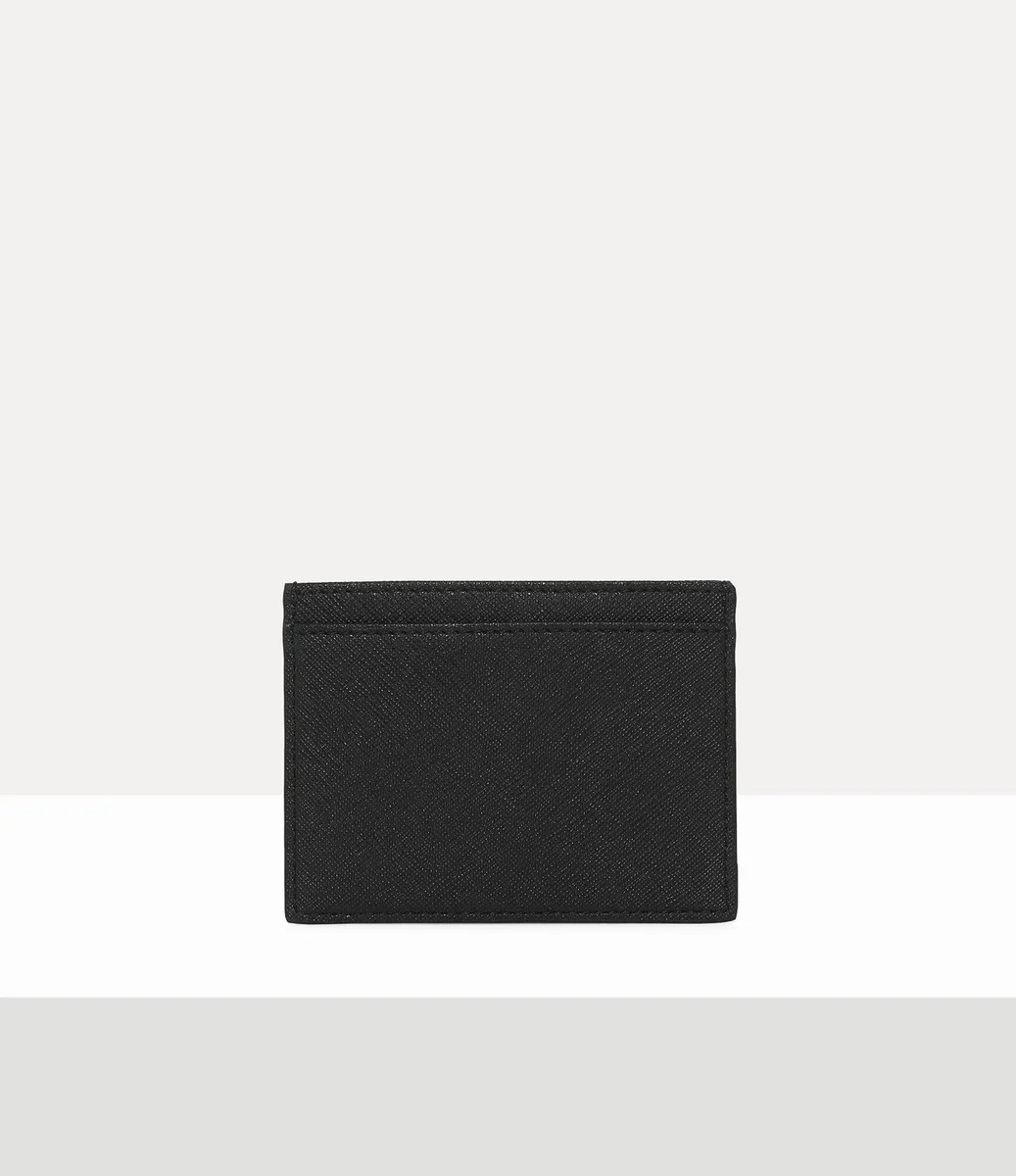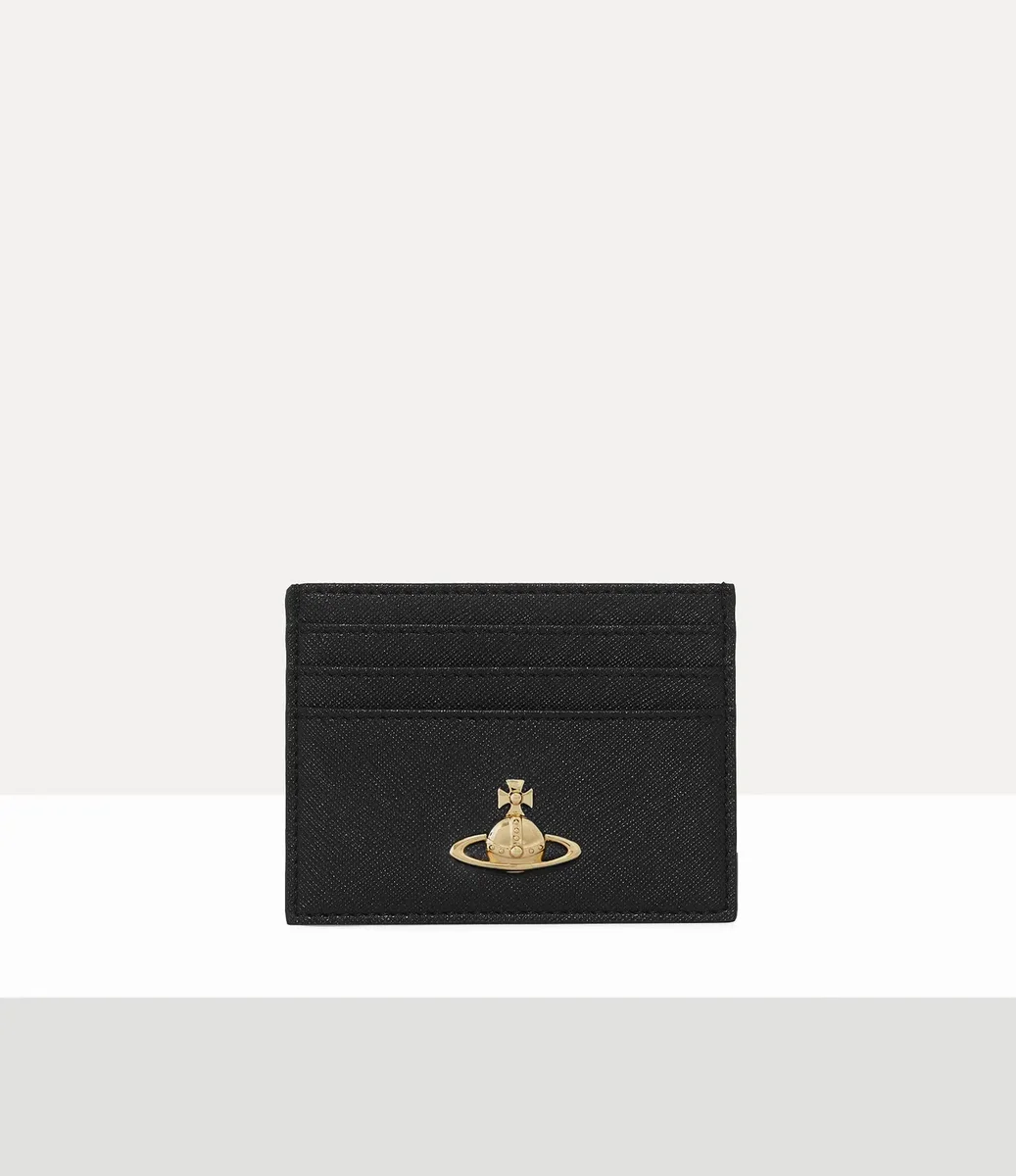 Der flache Kartenhalter verfügt über eine Prägung im Saffiano-Effekt, die das Design ziert, und ist mit farblich abgestimmten Nähten verziert, die die rechteckige Silhouette umrahmen. Das Stück ist auf der Vorderseite mit einem dreidimensionalen Kugelmotiv verziert, das Tradition symbolisiert und von den himmlischen Ringen des Saturn umgeben ist, die für die Zukunft stehen.