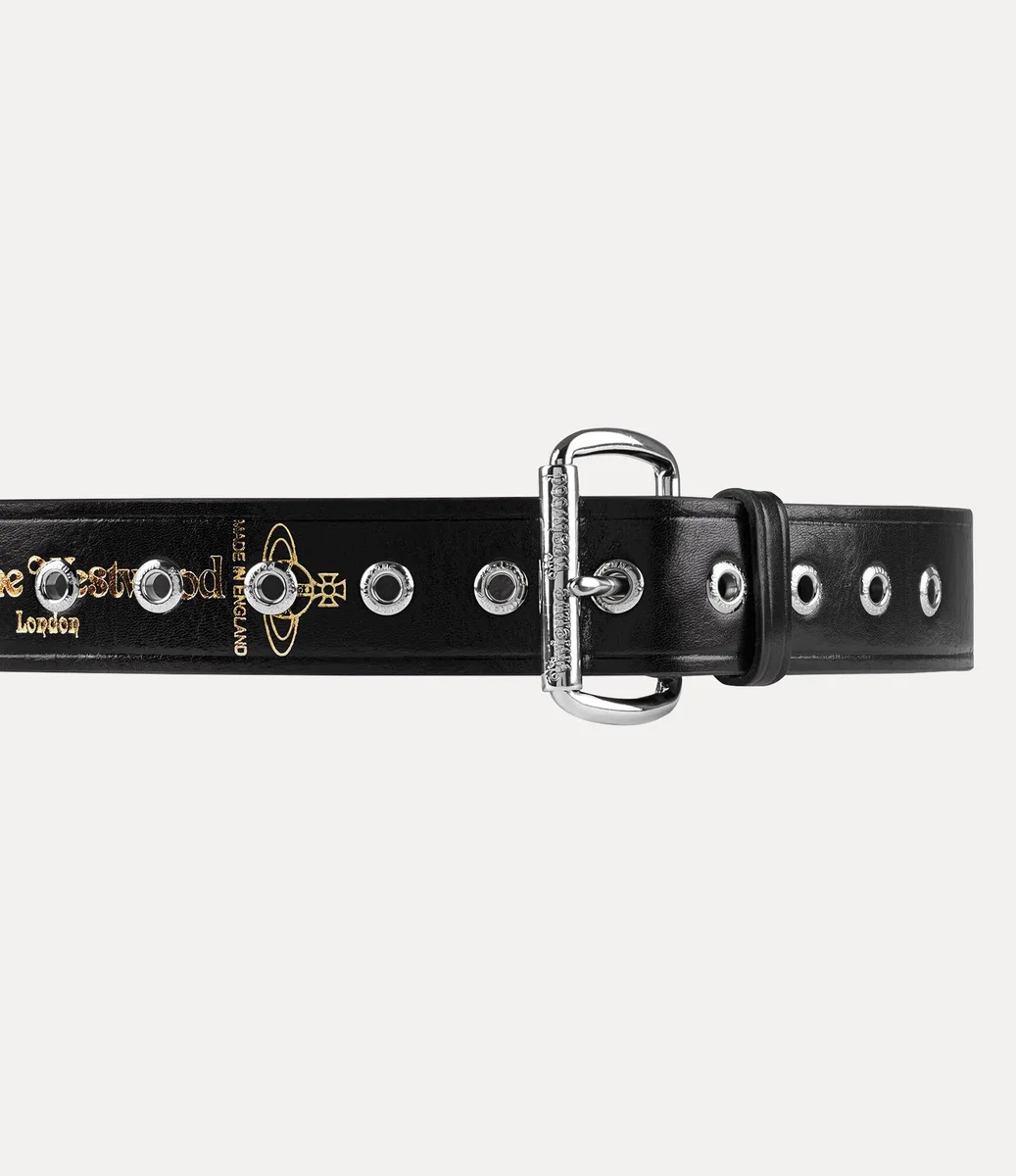 Unser Alex-Gürtel wurde in dieser Saison neu interpretiert und präsentiert sich nun in schwarzem Leder mit aktualisierten silberfarbenen Metallbeschlägen. Das Modell ist eine Hommage an das ursprüngliche Design und verfügt über eine gravierte Vivienne Westwood-Beschriftung auf der Schnalle, die durch ein foliengeprägtes Logo auf dem Riemen ergänzt wird.