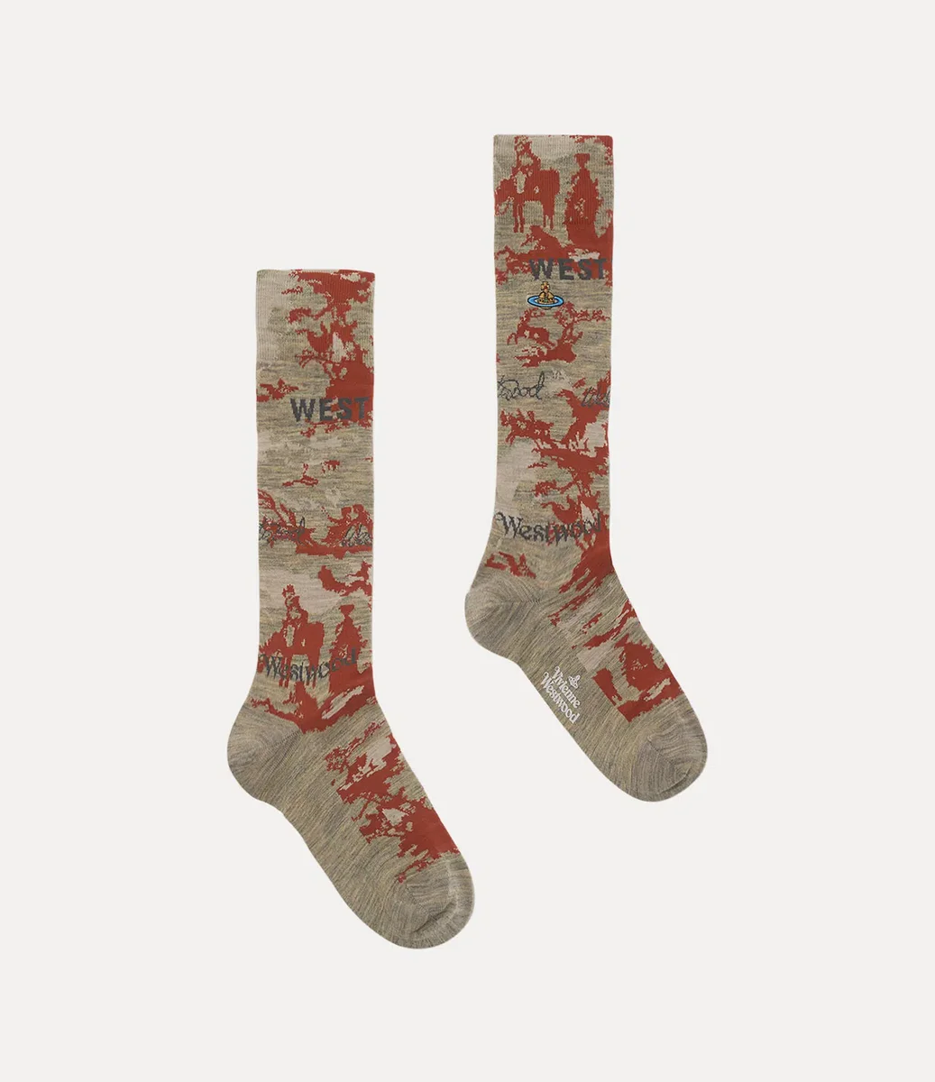 Unsere knöchellangen Socken sind mit einem Toile-de-Jouy-Jacquardmuster gestrickt, das ein romantisches, pastorales Motiv zeigt. Das Paar ist aus einer extrafeinen Merinowollmischung gefertigt und mit dem Orb-Motiv des Hauses verziert, das mit mehrfarbigem Garn gestickt ist.