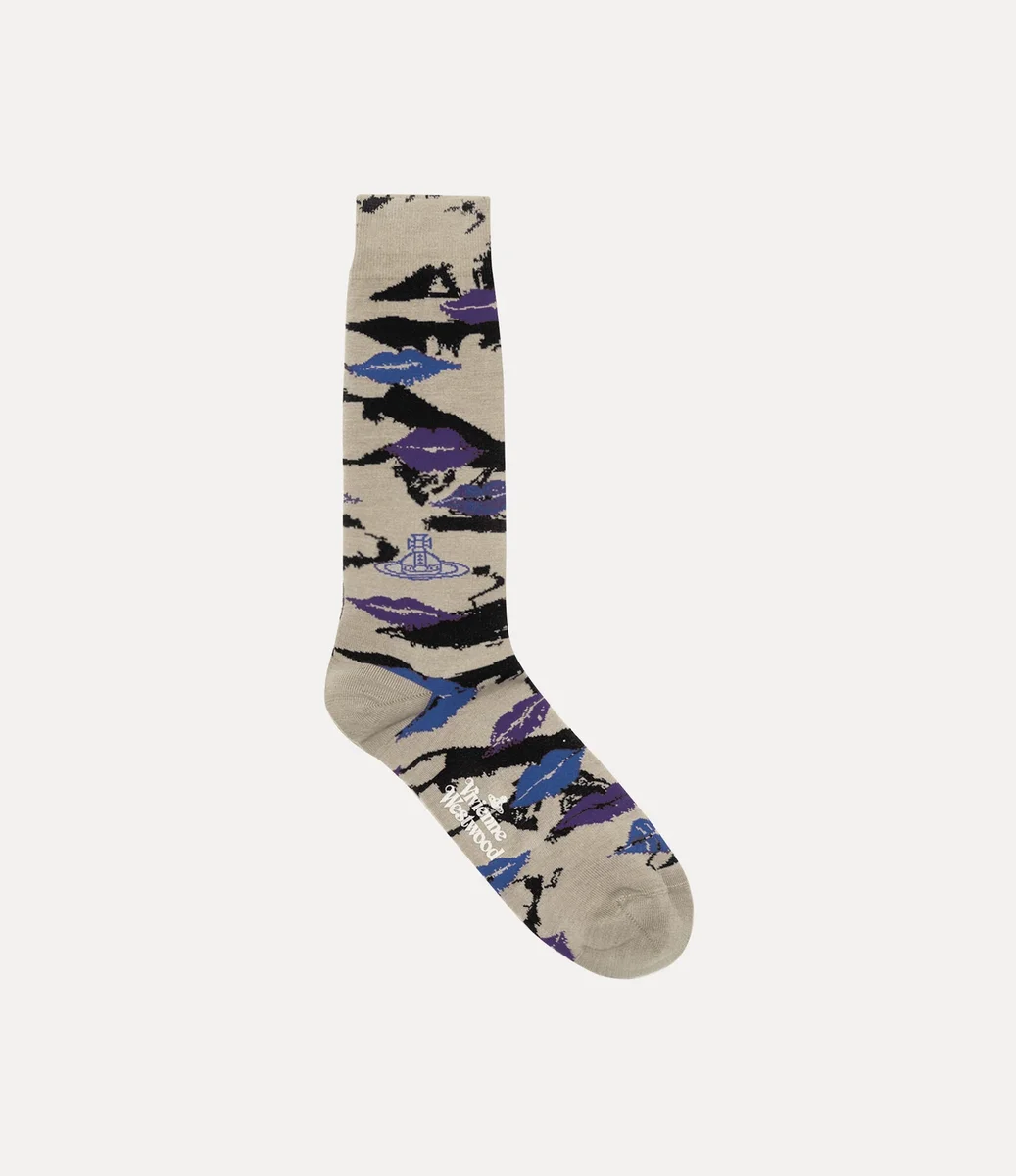 Unsere Socken haben eine gestrickte Jacquard-Basis, die mit dem Lippenstift-Motiv „Kisses” überzogen ist – das erstmals auf der Verpackung des Parfums Boudoir des Hauses zu sehen war –, um ein abstraktes Camouflage-Muster zu schaffen. Das aus einer weichen Baumwollmischung gefertigte Modell hat an den Seiten das charakteristische Orb-Motiv.