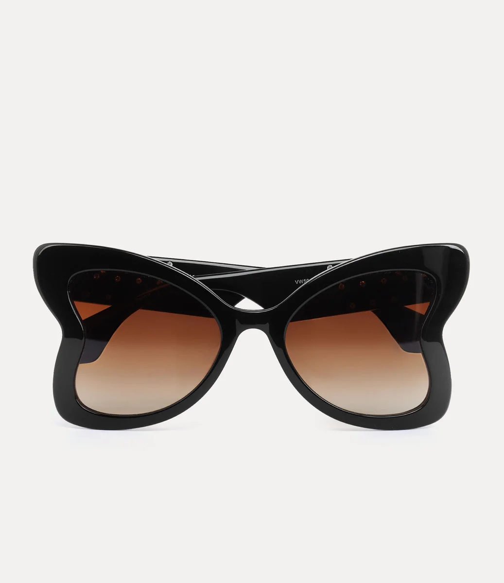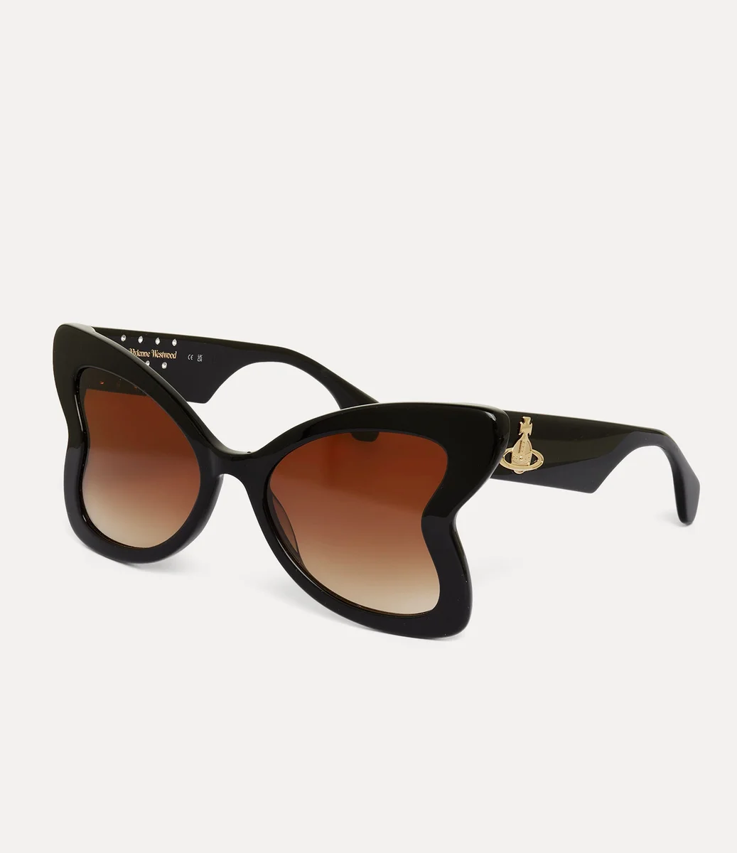 Unsere handgefertigte Athalia Sonnenbrille mit übergroßem, von Schmetterlingen inspiriertem Rahmen verfügt über kristallverzierte Innen- und Verlaufsgläser. Inspiriert von der Schönheit georgianischer Schmuckmedaillons sind die Bügel mit einer goldfarbenen Kugel verziert.