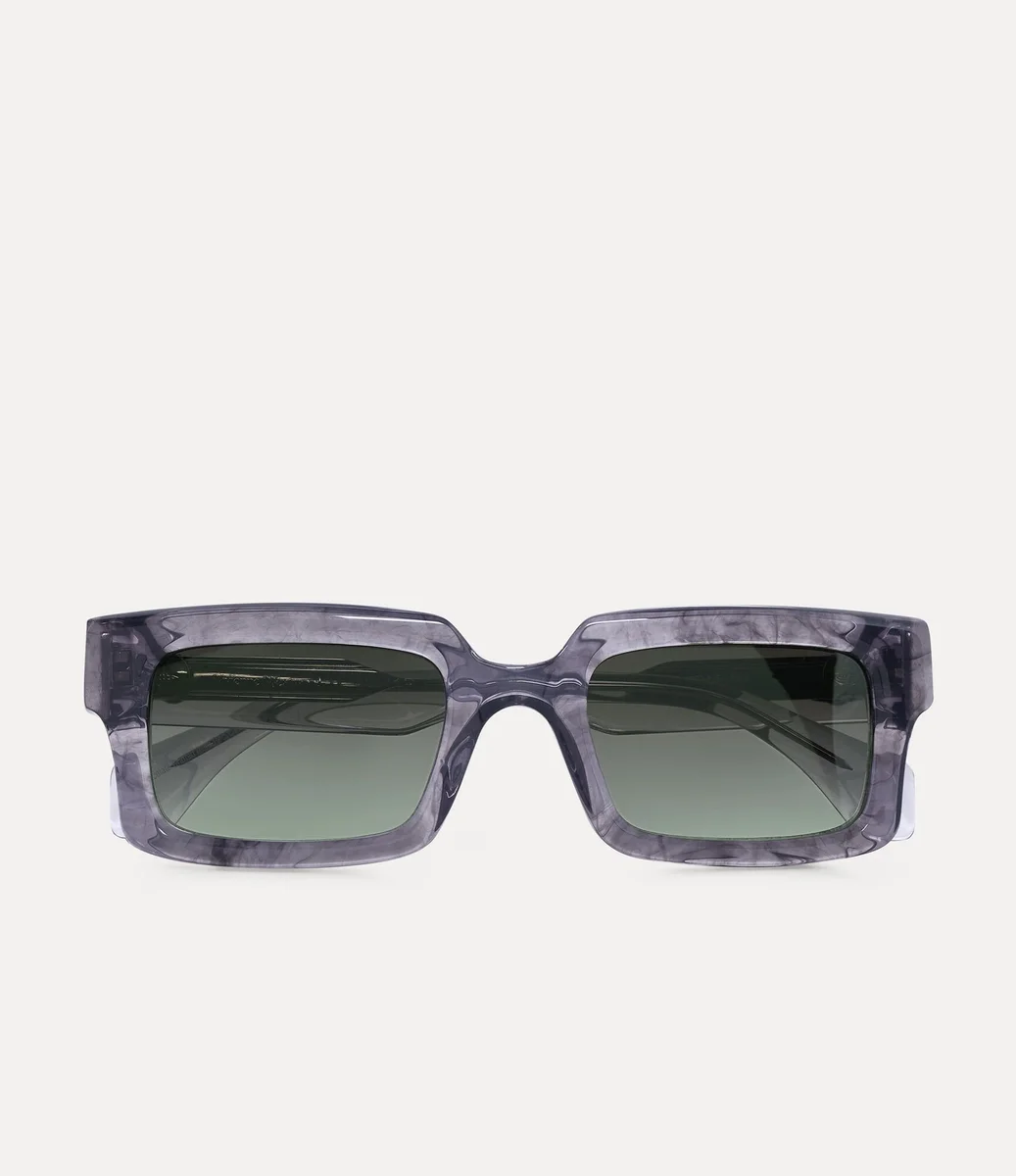 Die Costello Sonnenbrille zeichnet sich durch eine kühne und zeitlose Ästhetik aus, die von legendären Kulturschaffenden aus Theater und Film inspiriert ist. Das Design mit quadratischem Rahmen und abgestuften Gläsern ist aus grauem Acetat mit Marmoroptik gefertigt und mit polierten Hornakzenten am Außenrand verziert – eine Anspielung auf Viviennes ikonisches Horn-Alice-Band.