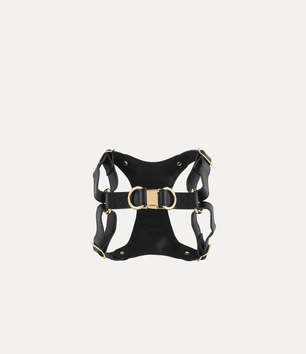 Das Hundegeschirr ist vom Steiff-Stoff aus der Gold Label-Kollektion „Wild Beauty” aus dem Herbst/Winter 2001 inspiriert und mit einem auffälligen Leopardenmotiv verziert. Es verfügt über eine geformte Brustplatte und verstellbare schwarze Riemen und ist mit polierten goldfarbenen Metallbeschlägen und dem charakteristischen Kugelemblem in der Mitte versehen.