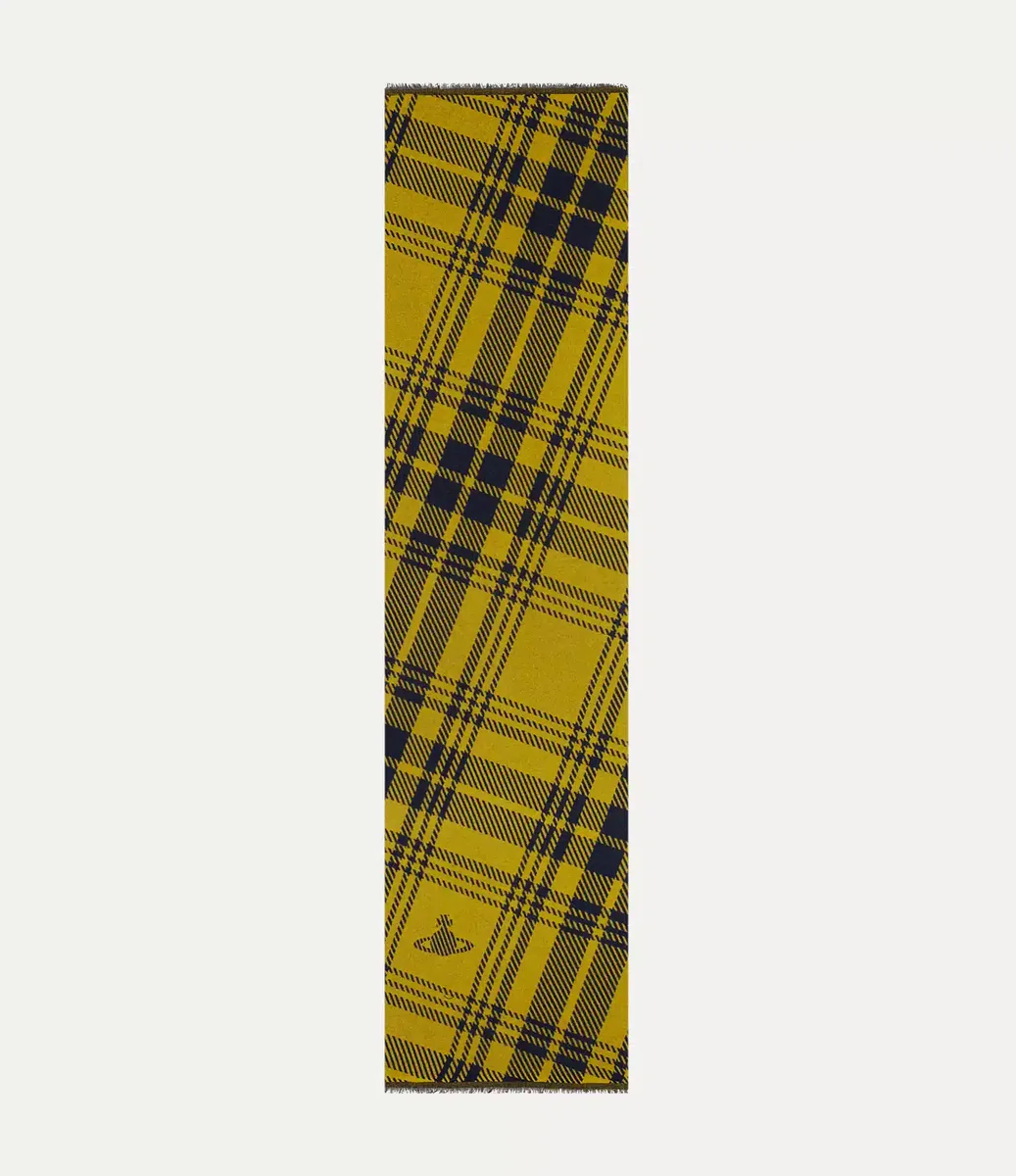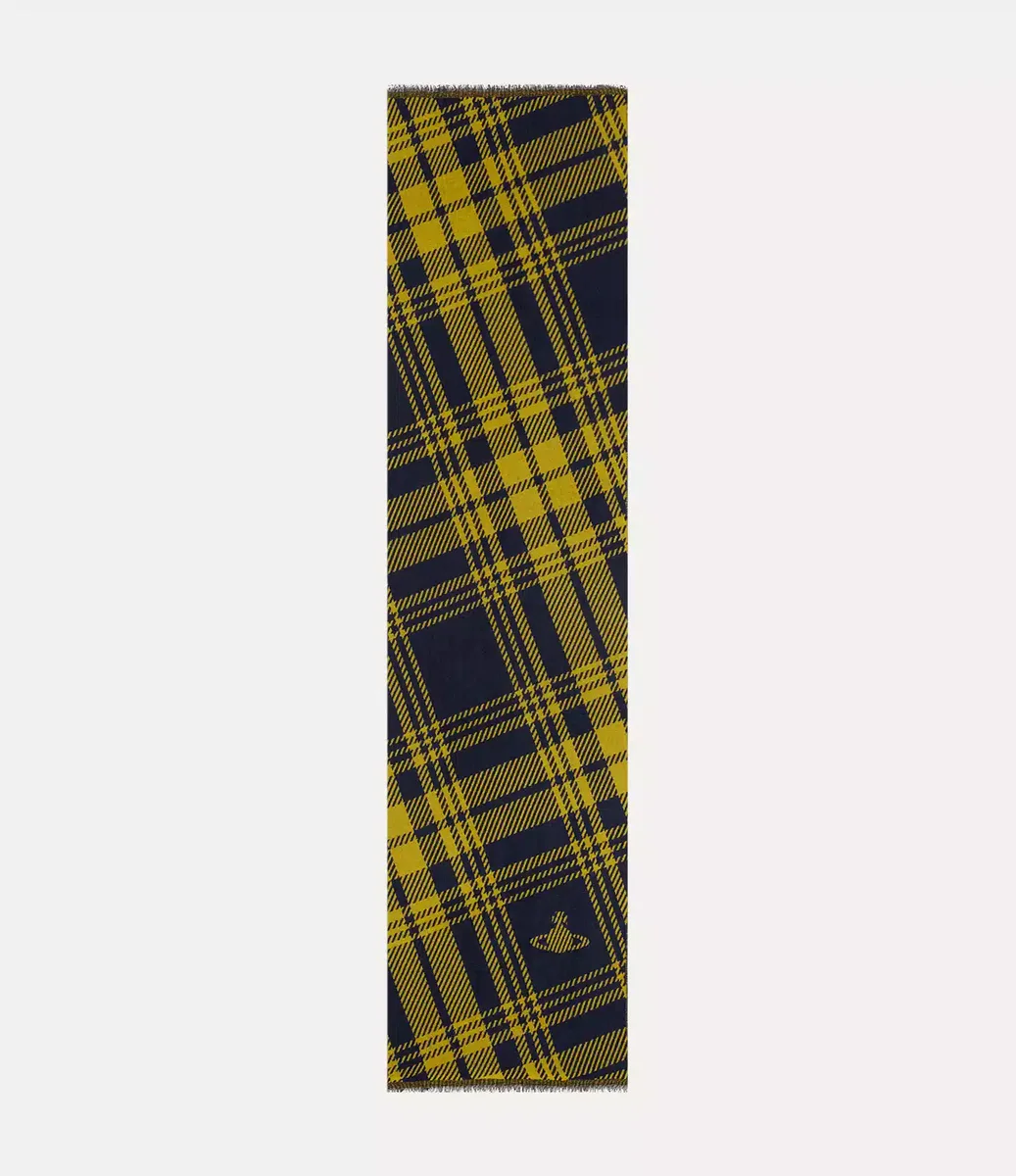 Unser Schal ist aus weicher Wolle gefertigt und mit einem Tartan-Motiv gewebt, das von traditionellen schottischen Highland-Insignien inspiriert ist. Das Stück hat eine klassische rechteckige Form und ist mit leicht gefransten Kanten und dem „Silhouette Orb”-Emblem des Hauses versehen.