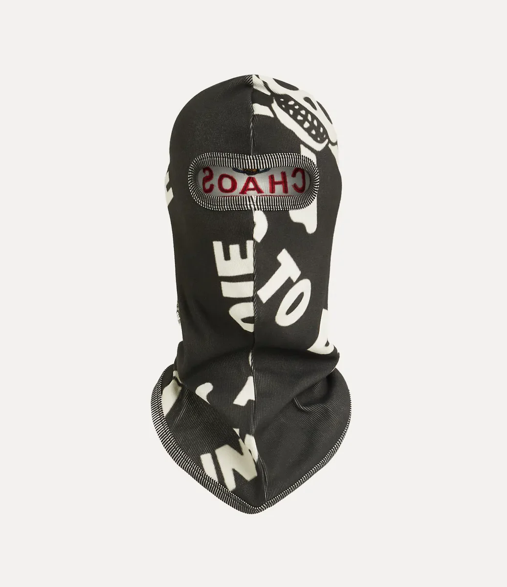 - Mit kontrastierendem „CHAOS“-Motiv, das über die Augenöffnung gestickt ist