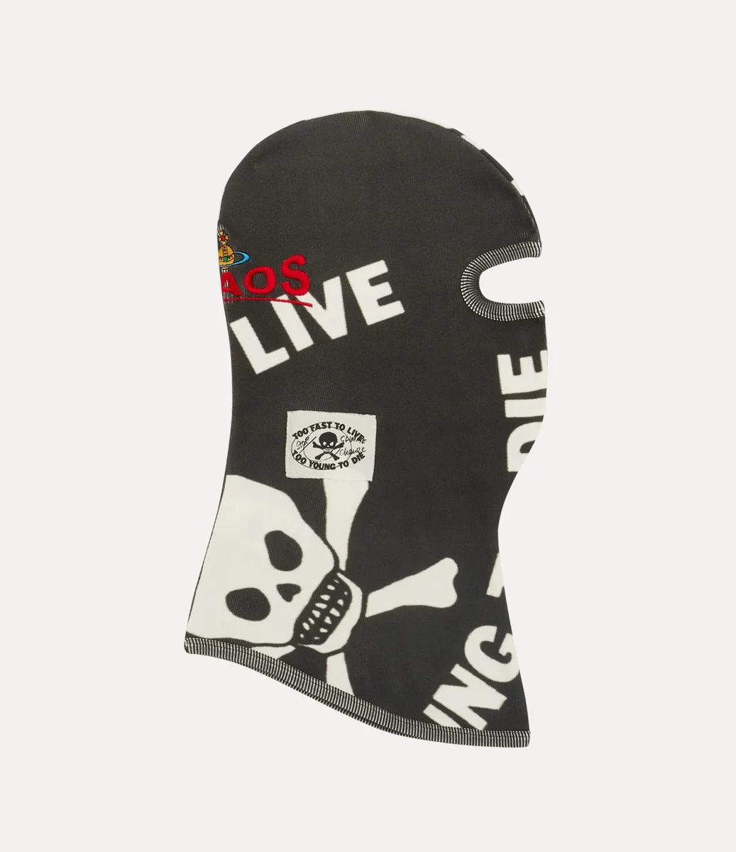Unsere Worlds End Storm Maske ist aus einem weichen, elastischen Strickstoff gefertigt, der sich angenehm anpasst und eine formschöne Silhouette mit vollständiger Kopf- und Halsbedeckung bietet. Das Design zeichnet sich durch ein auffälliges, einfarbiges Totenkopf-Motiv aus, das sich über das gesamte Design zieht und an Viviennes charakteristische Punk-Ästhetik erinnert.