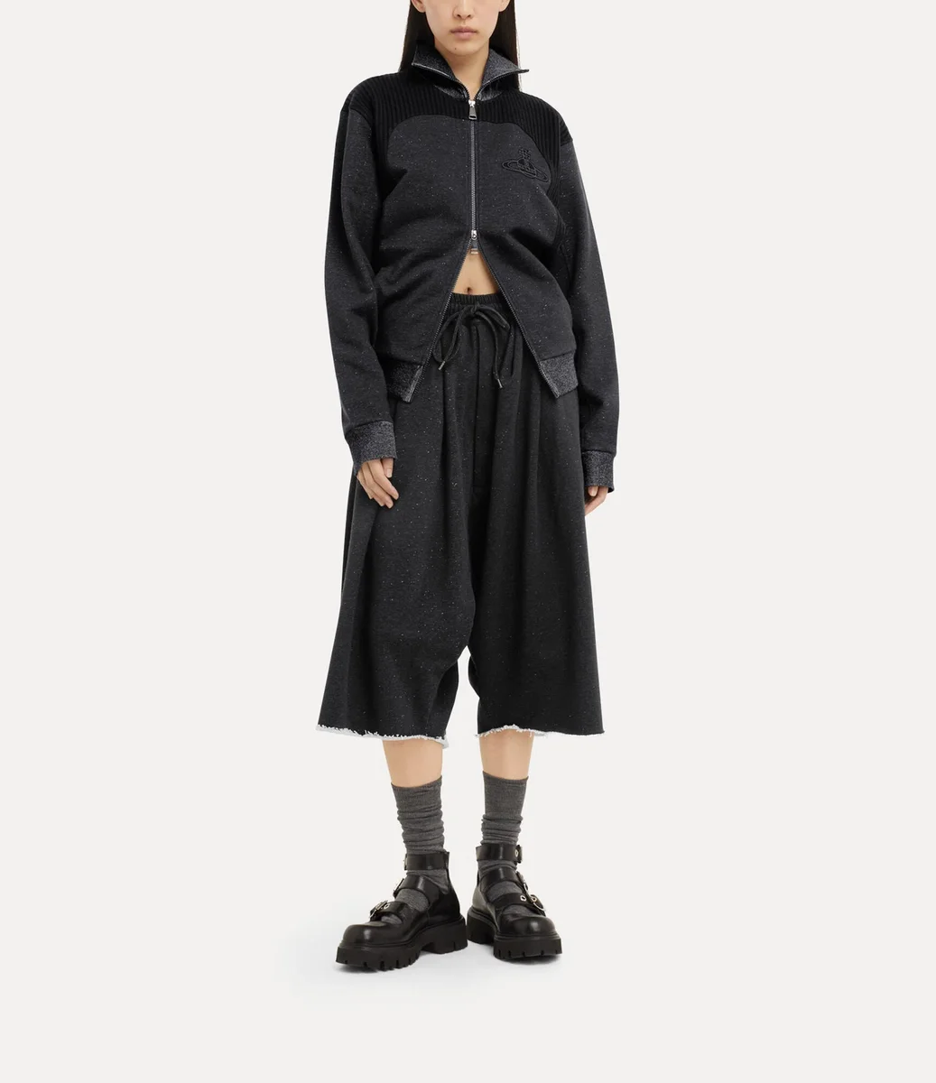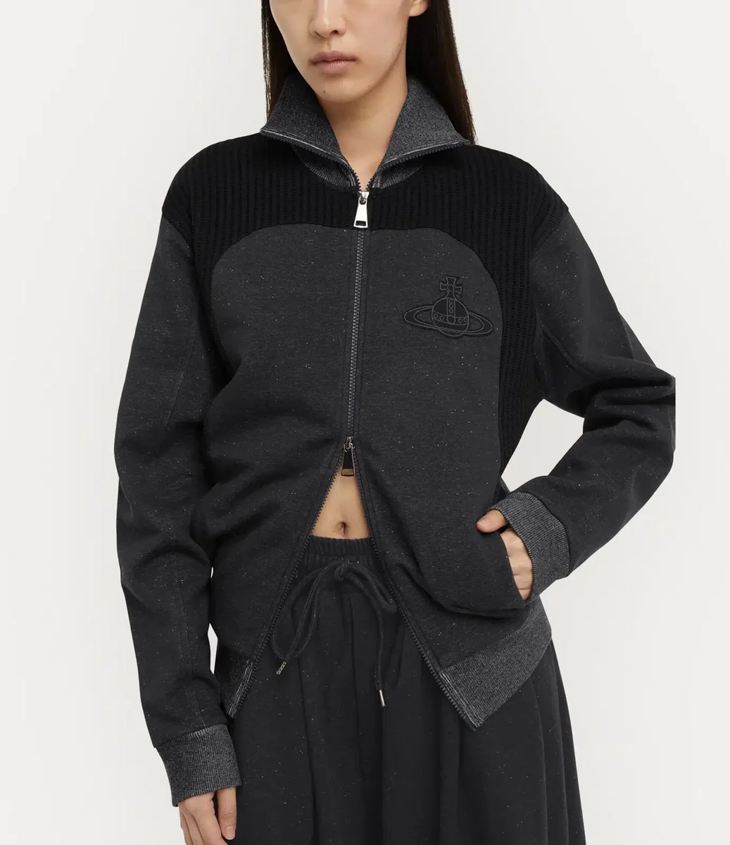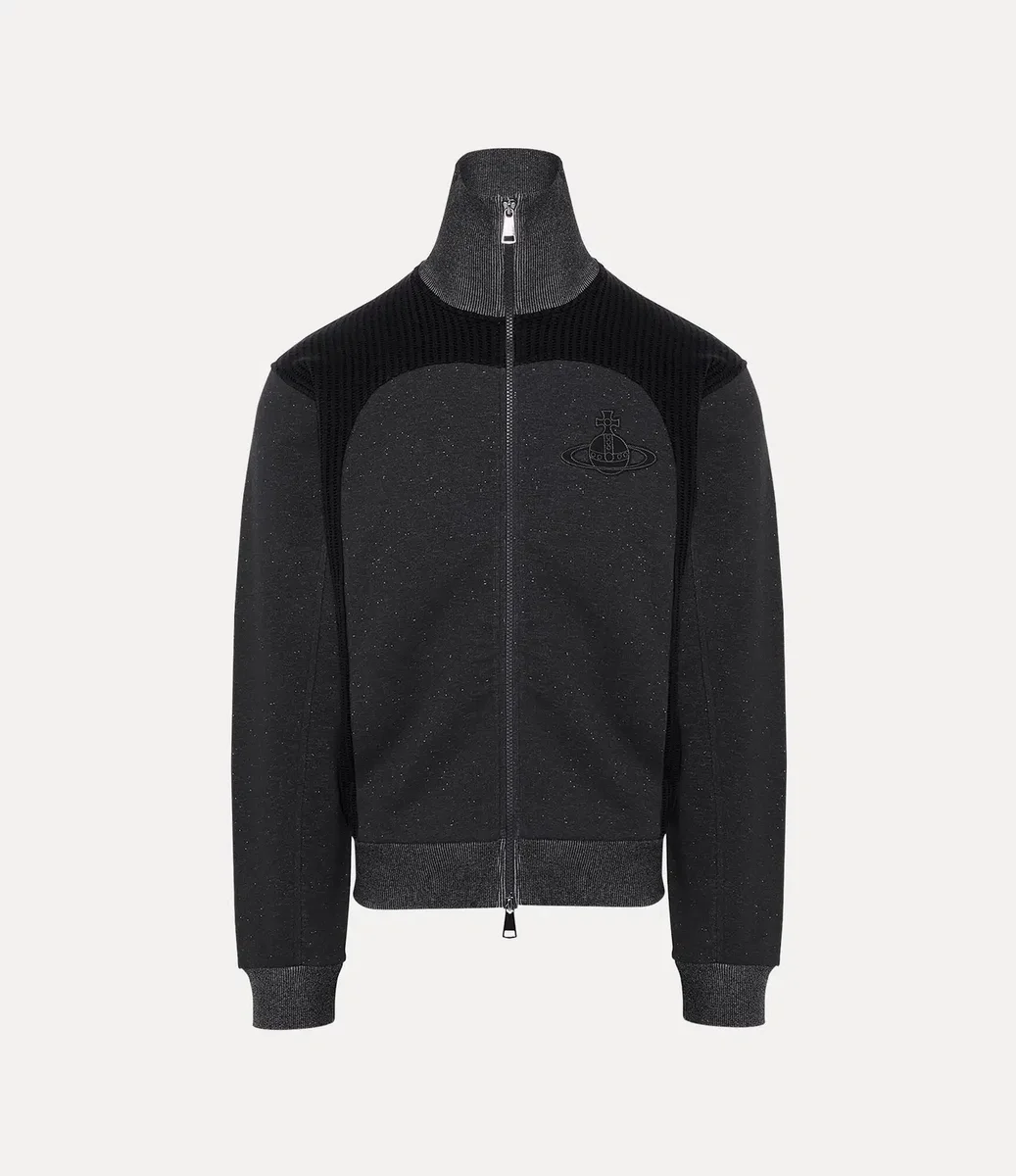 Die Alien Track Jacke dieser Saison führt den Zwei-Wege-Reißverschluss wieder ein – ein Detail, das Vivienne Westwood erstmals in den späten 1970er- und frühen 1980er-Jahren als Symbol für Nonkonformismus und als Markenzeichen ihrer rebellischen Punk-Ästhetik verwendete. Das Modell mit hohem Ausschnitt und durchgehenden Rippstrick-Einsätzen ist mit dem Graffiti-Kugel-Motiv des Hauses verziert, das dezent in farblich abgestimmten Fäden auf die Brust gestickt ist.