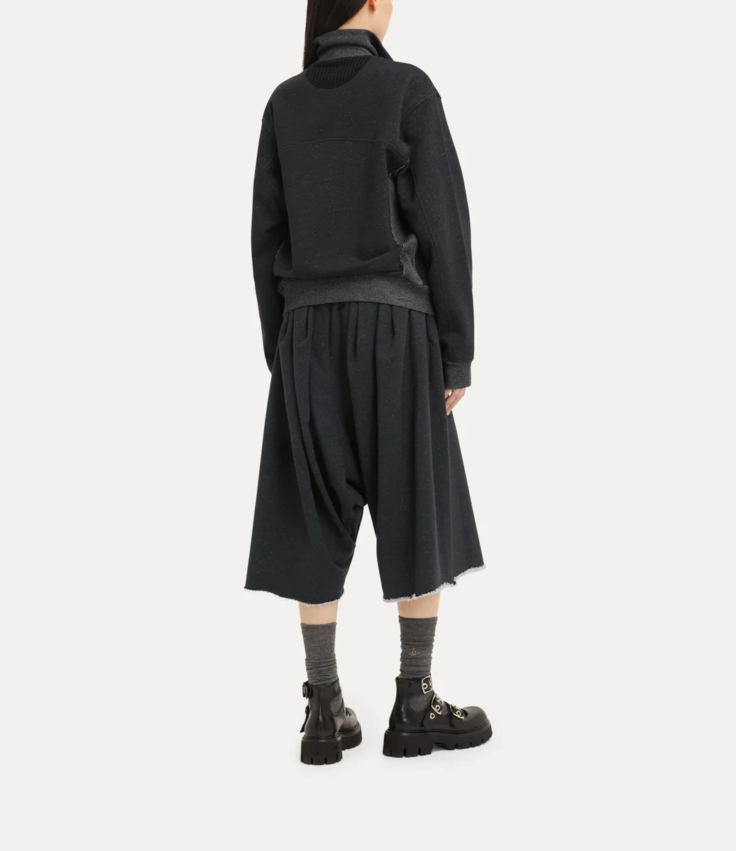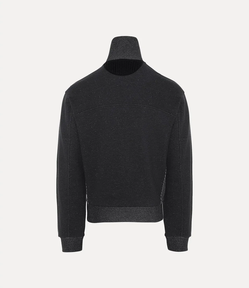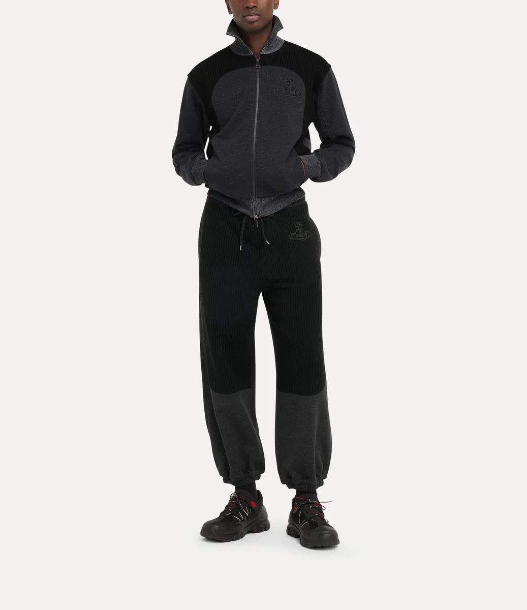 Die Alien Track Jacke dieser Saison führt den Zwei-Wege-Reißverschluss wieder ein – ein Detail, das Vivienne Westwood erstmals in den späten 1970er- und frühen 1980er-Jahren als Symbol für Nonkonformismus und als Markenzeichen ihrer rebellischen Punk-Ästhetik verwendete. Das Modell mit hohem Ausschnitt und durchgehenden Rippstrick-Einsätzen ist mit dem Graffiti-Kugel-Motiv des Hauses verziert, das dezent in farblich abgestimmten Fäden auf die Brust gestickt ist.