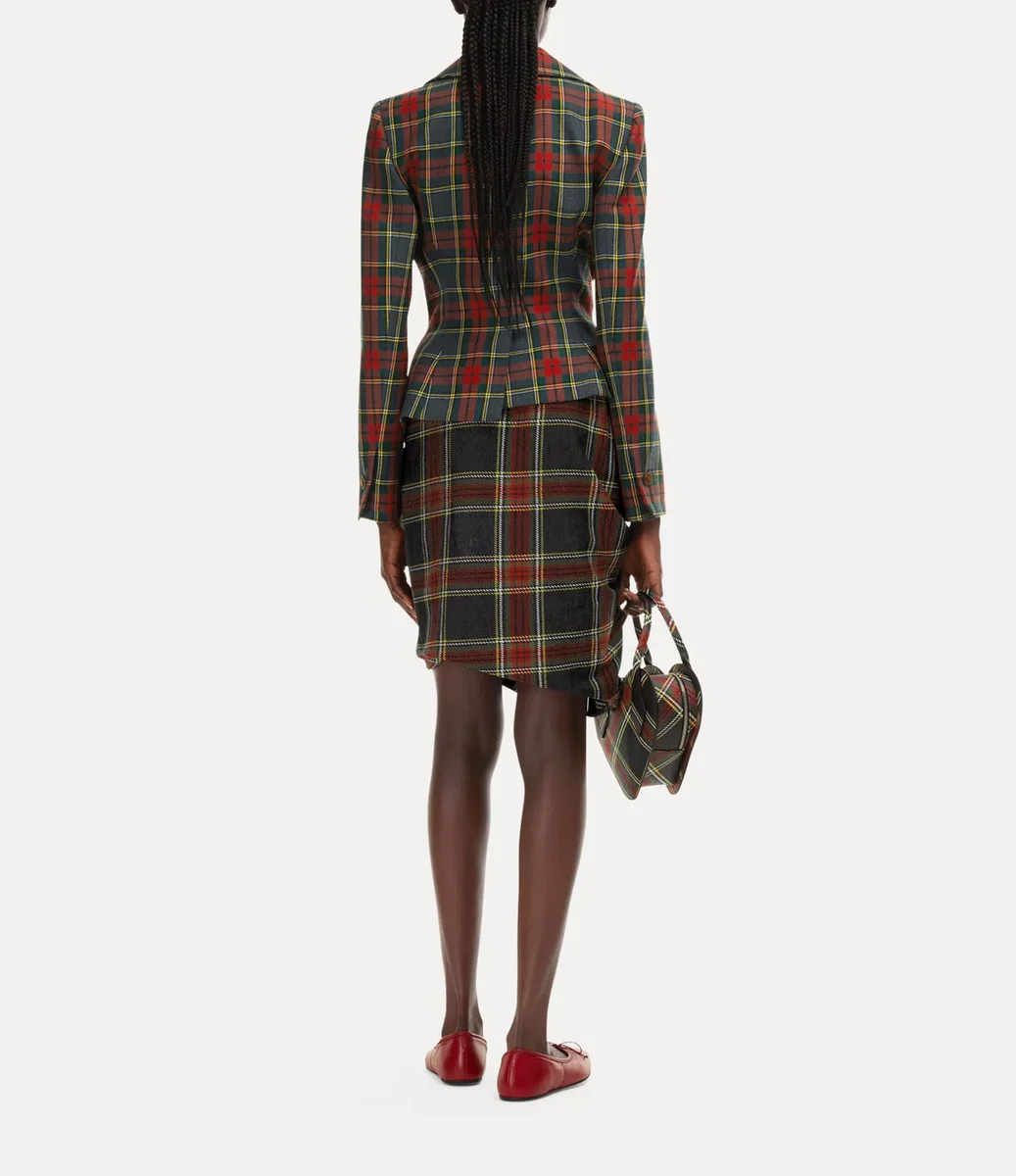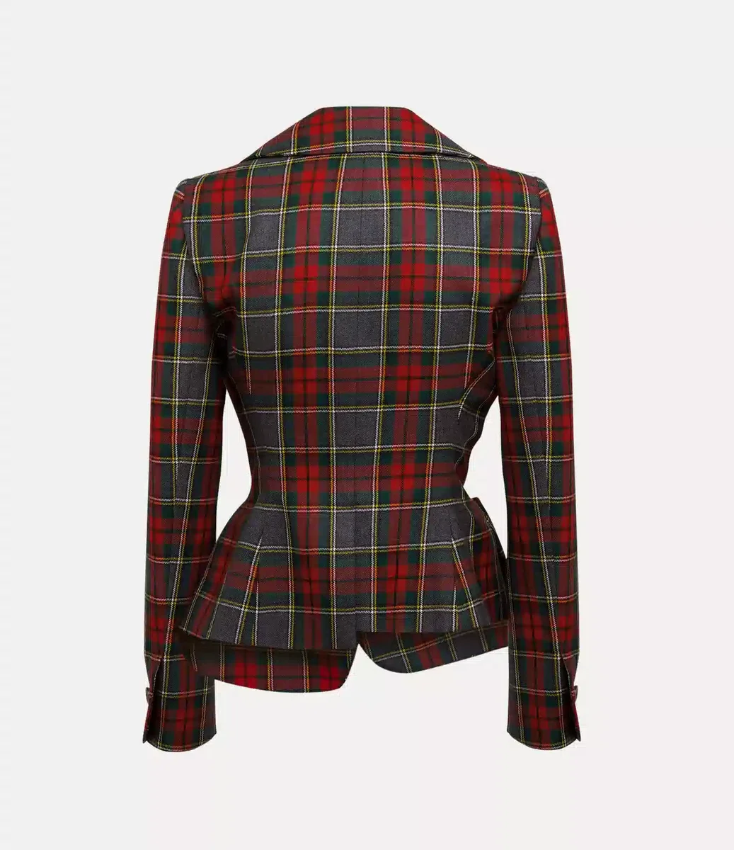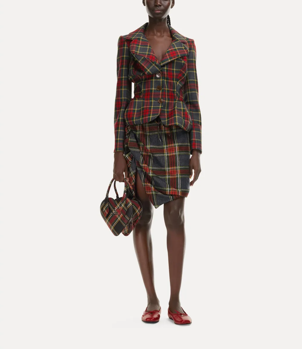 Unsere Drunken Jacke basiert auf Viviennes originellem, experimentellem Schnittmuster-System, bei dem Kleidungselemente verzerrt werden und eine fast surreale Form annehmen. Das Modell ist in dieser Saison in dem lebhaften Tartanmuster „Scarlet“ erhältlich und mit einer Knopfleiste vorne versehen.