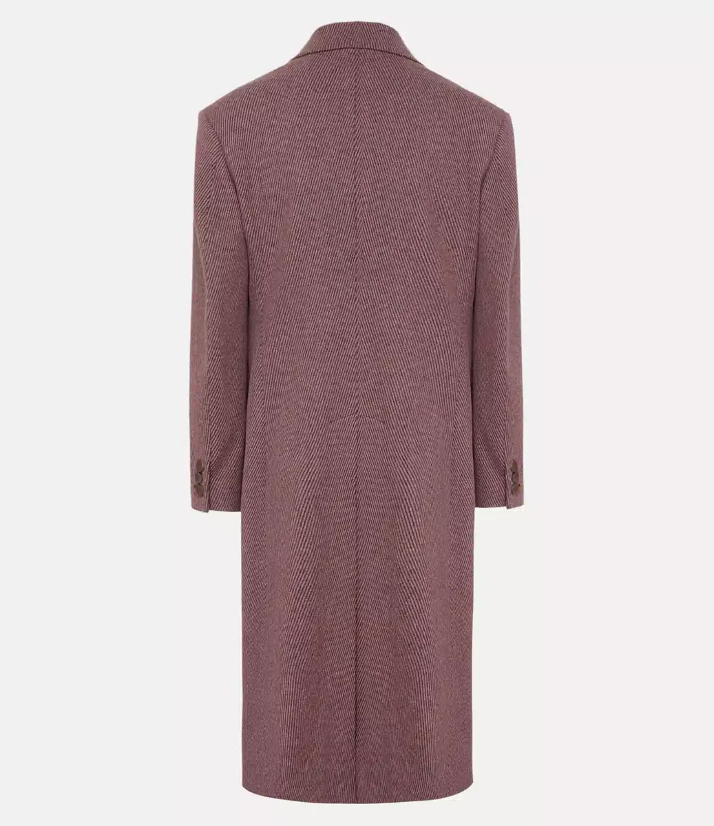Der Winston-Mantel von Vivienne Westwood zeichnet sich durch ein strukturiertes Wollprofil aus, ergänzt durch eine diagonale Köperbindung in einem gedeckten Burgunderton.