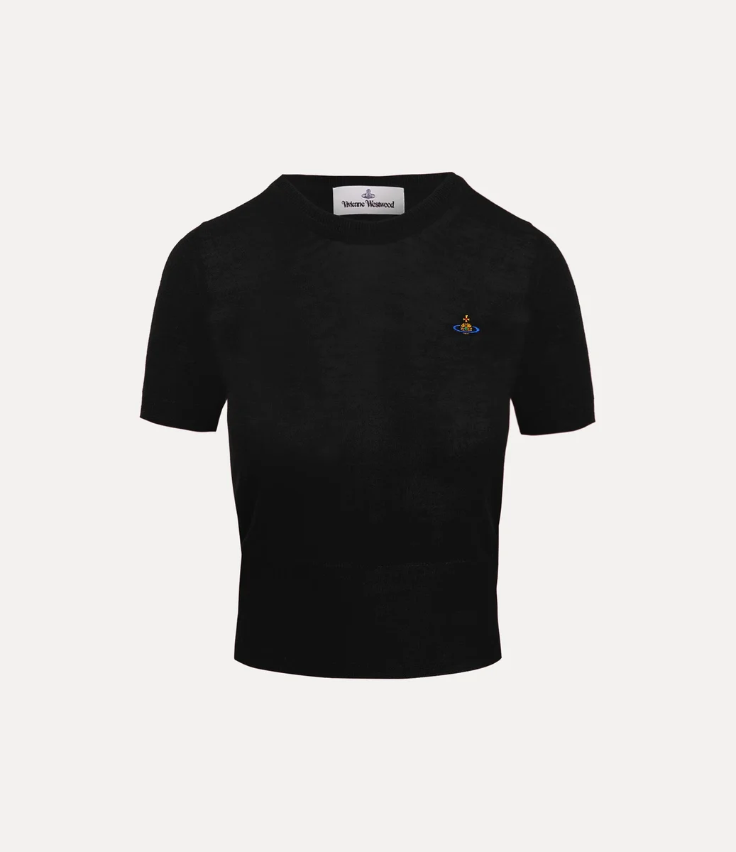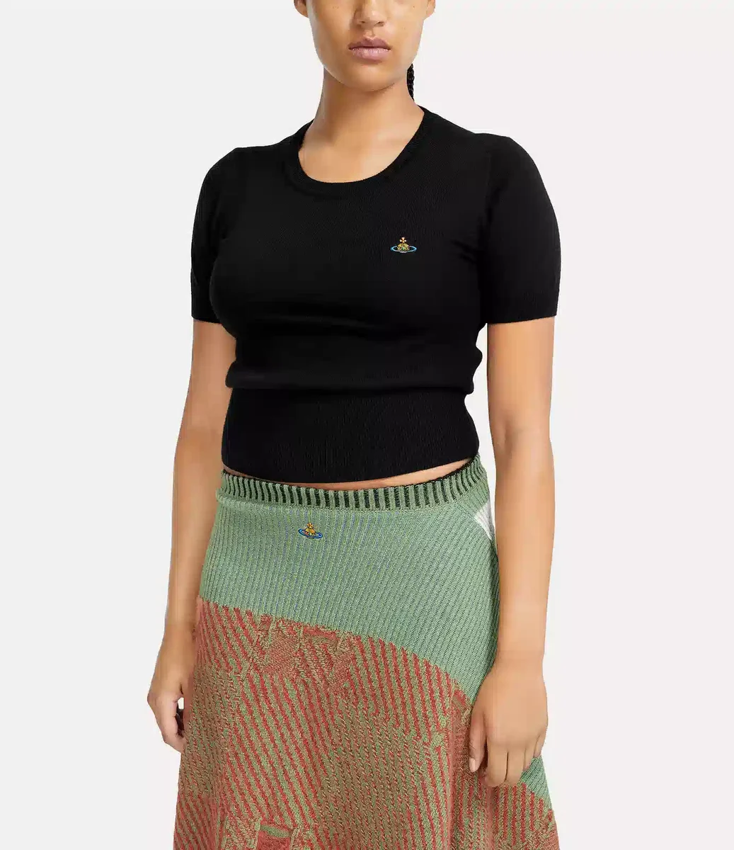Unser Bea-Oberteil wurde in dieser Saison neu aufgelegt. Als Teil unserer klassischen Kollektion verfügt dieses kurzärmelige Oberteil aus Baumwollkaschmir über gerippte Bündchen und eine mehrfarbige Stickerei auf der Brust – ein Symbol für Viviennes Vision, Tradition in die Zukunft zu tragen.