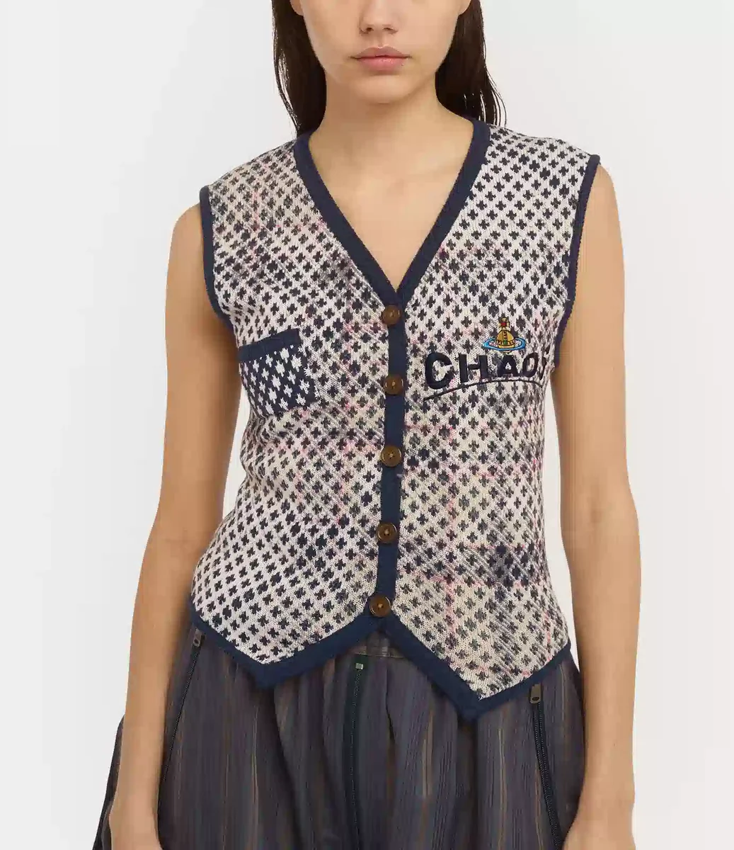 Unsere Distressed Tartan Weste aus einer weichen Baumwoll-Woll-Mischung ist mit dem klassischen Crosses Argyle Jacquard-Muster verziert, das mit einem „Distressed”-Tartan-Print überlagert ist. Das Modell mit V-Ausschnitt und Knopfleiste auf der Vorderseite ist mit einem Orb-Motiv und dem ikonischen „CHAOS”-Motiv bestickt.