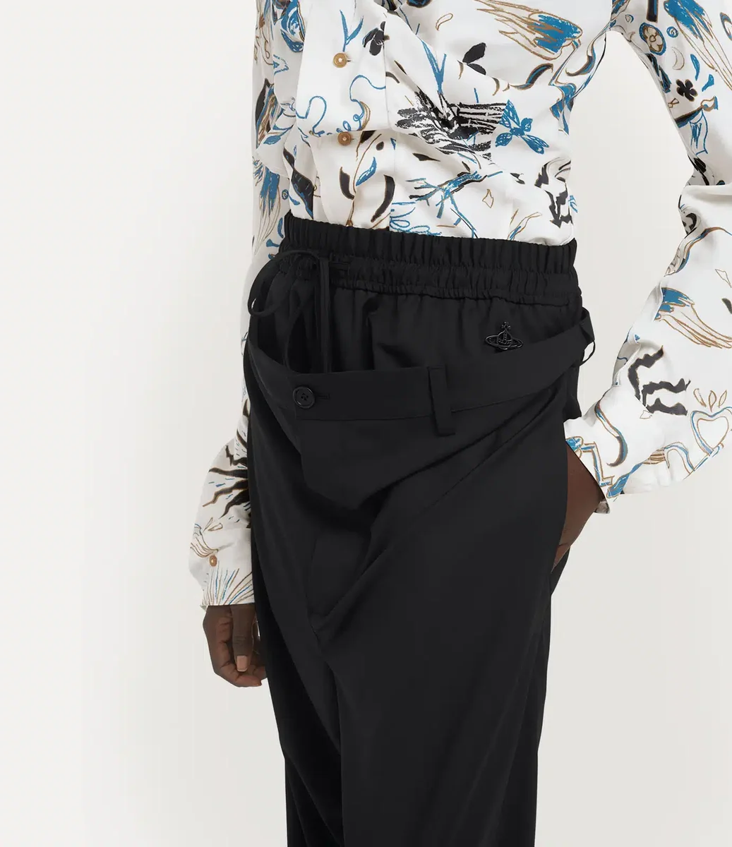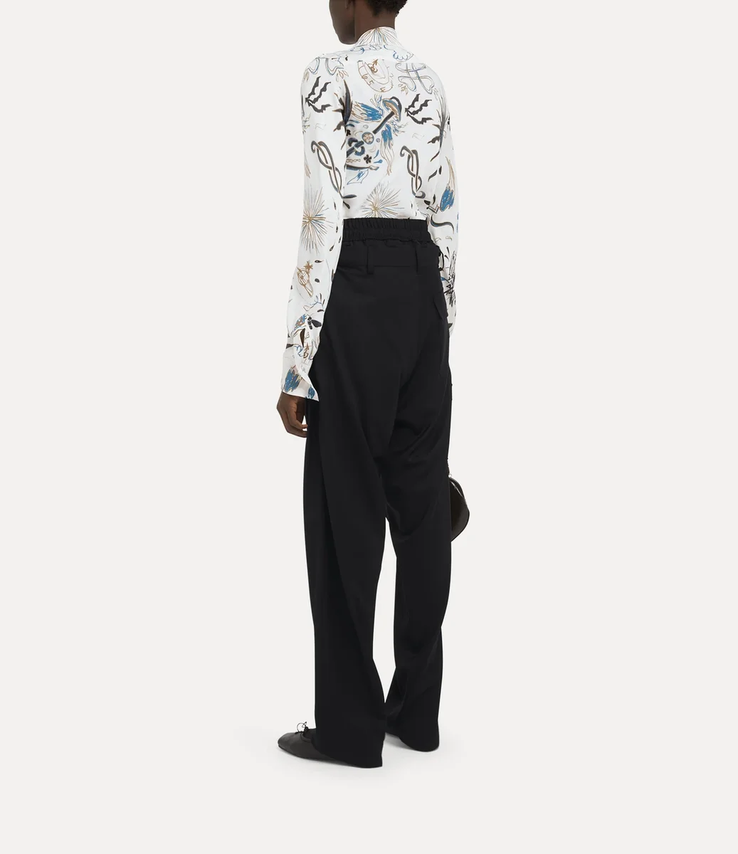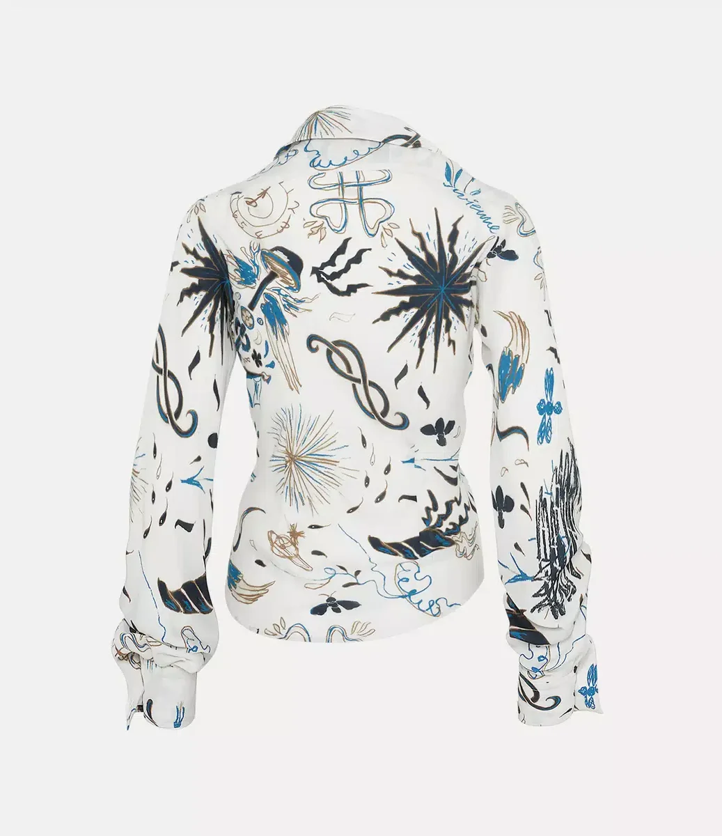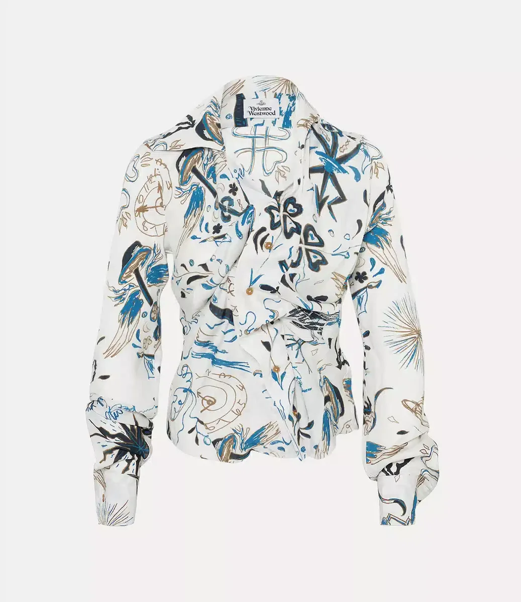 Unser Drunken Shirt wurde mit Viviennes experimentellem Drunken Tailoring System entworfen und hat eine versetzte Knopfleiste und einen asymmetrischen Saum. Inspiriert von „Der lachende Kavalier” von Frans Hals ist das Kleidungsstück mit einem abstrakten Grafikdesign bedruckt, das die charakteristische Ikonografie des Hauses aufgreift.