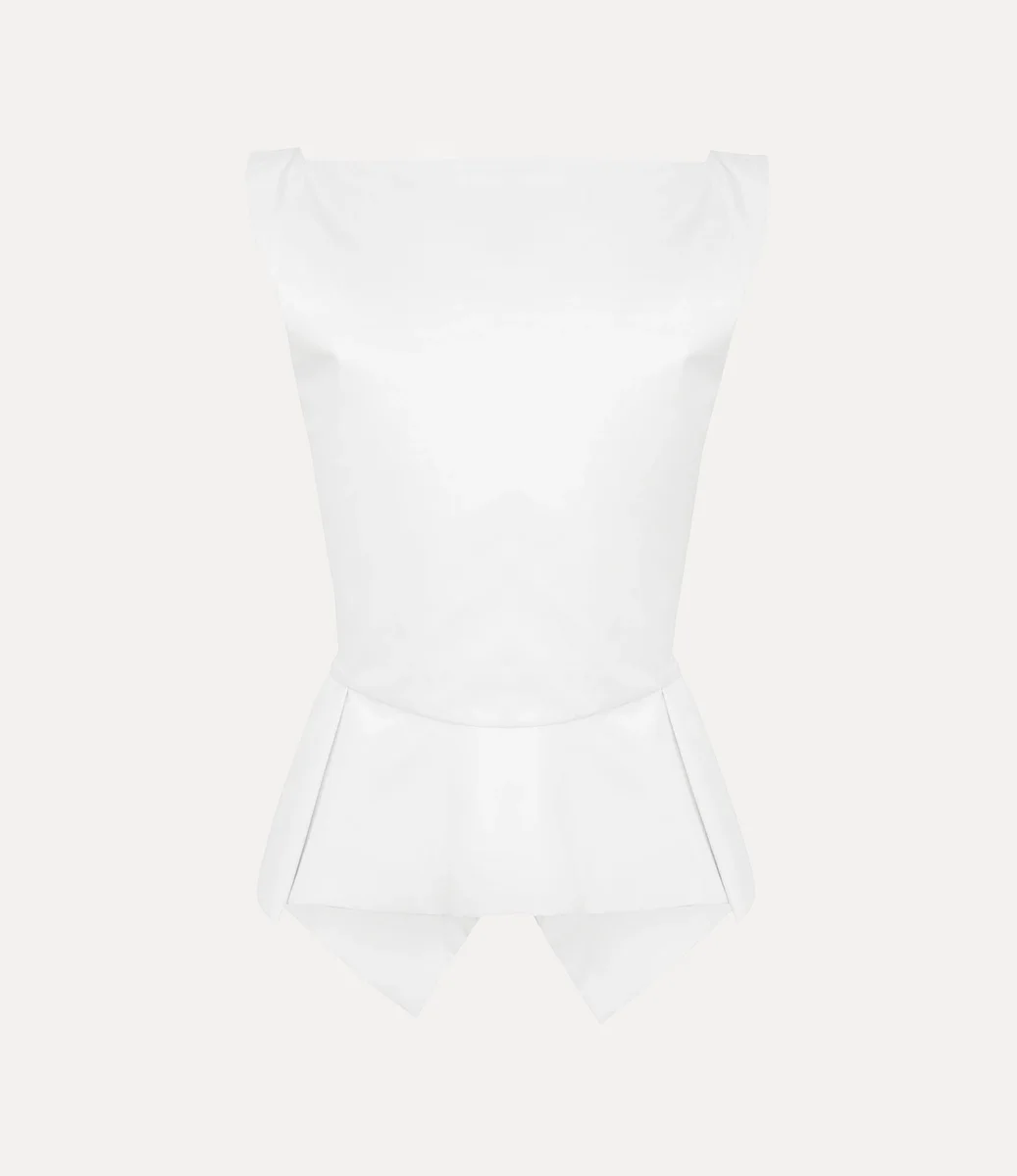 Unsere Monday Weste folgt einer Archiv-Silhouette, die erstmals in der Frühjahr/Sommer-Kollektion 1997 „Viva la Bagatelle” vorgestellt wurde. Das Kleidungsstück hat einen klassischen quadratischen Ausschnitt und fällt sanft in einen ausgestellten Schößchen-Saum, der sich zu zarten Falten und einem umgekehrten V-Design vorne zusammenzieht.