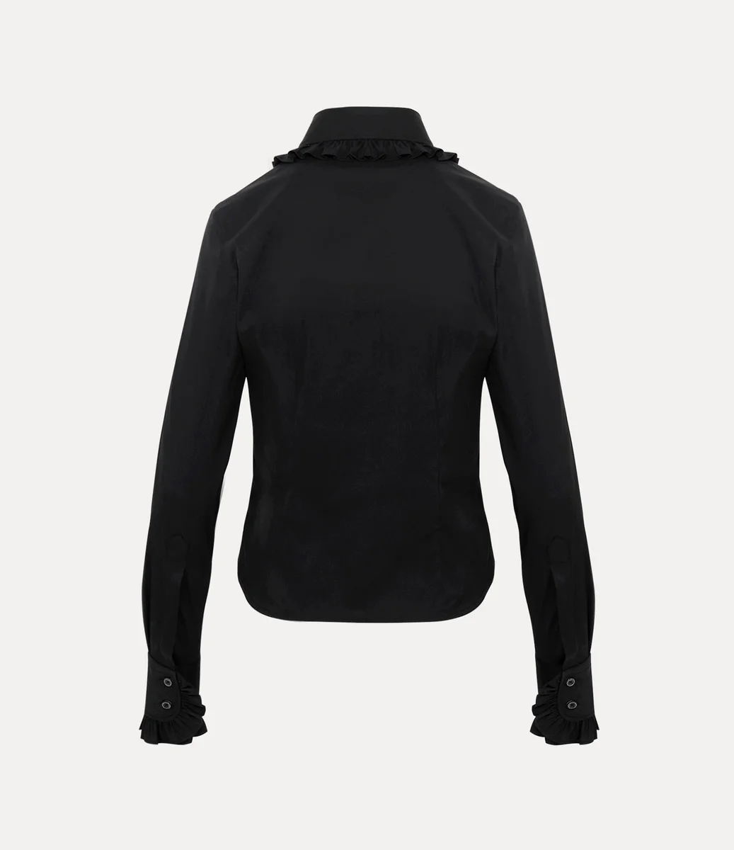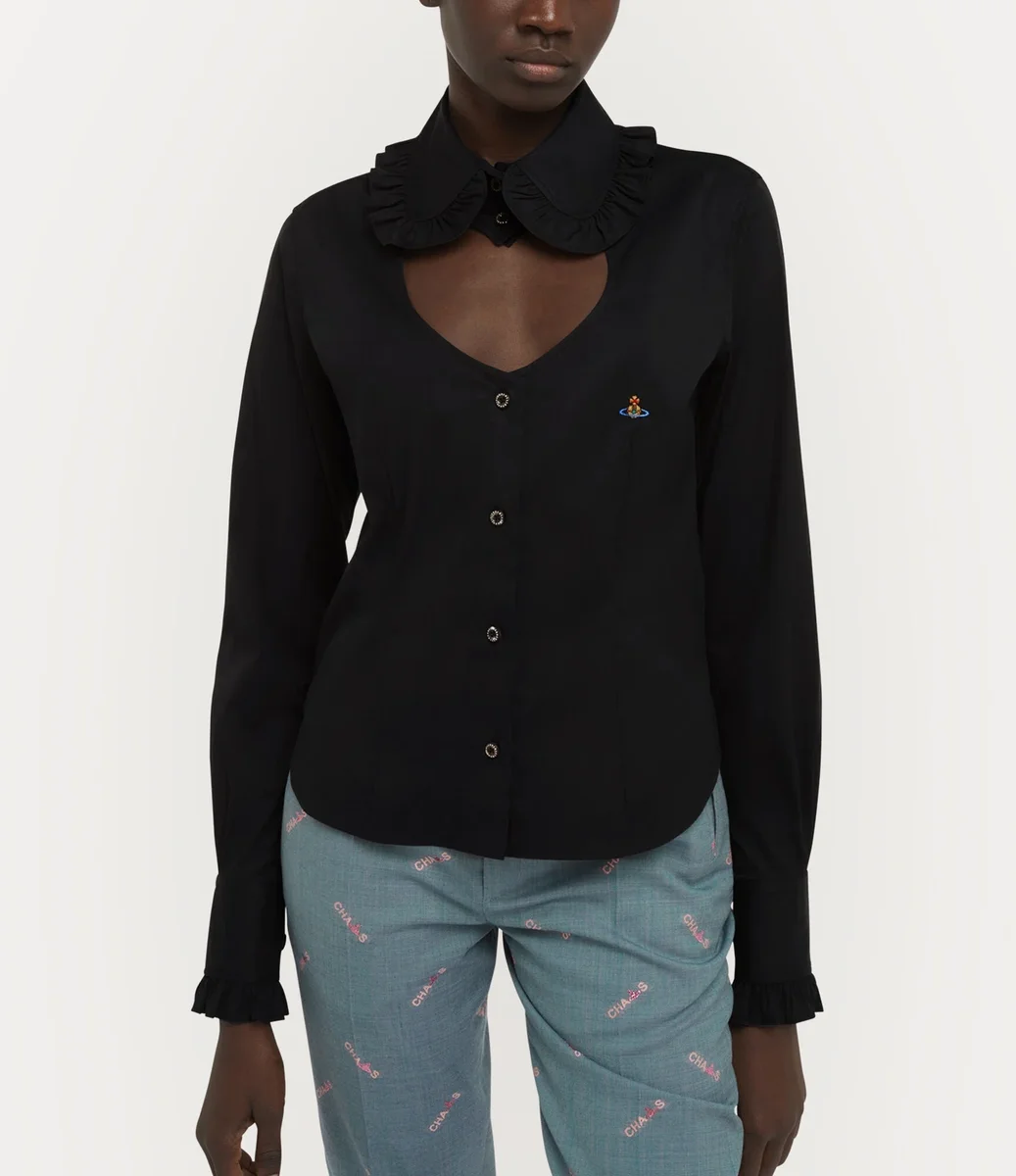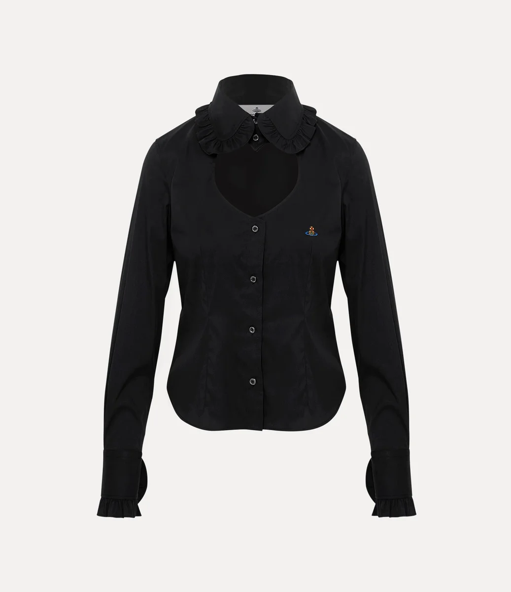 Das Toulouse Frill Shirt greift unseren klassischen Ausschnitt mit Herzausschnitt wieder auf – ein Symbol für Viviennes Liebe zur Menschheit und zum Planeten. Das Kleidungsstück ist mit unserer charakteristischen Orb-Stickerei auf der Brust verziert und verfügt über einen zart abgerundeten Kragen, der von gerafften Rüschen umrahmt wird.