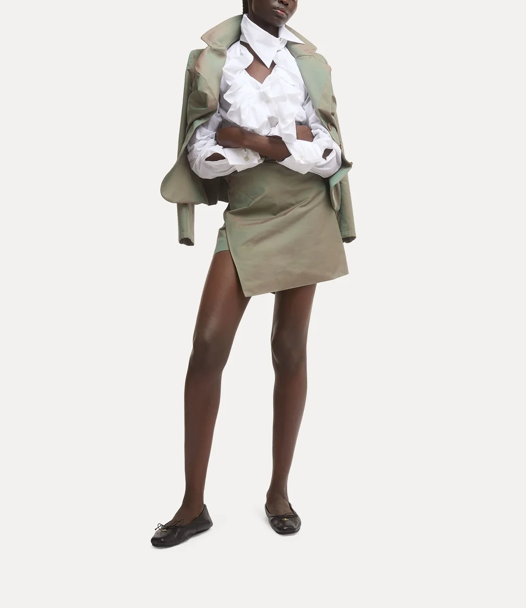 Unser Mini Infinity Rock ist aus einer Baumwollmischung gefertigt, die sich elegant um die Hüften schmiegt, und verfügt über einen mittelhohen Bund, der eine schlanke, strukturierte A-Linien-Silhouette mit asymmetrischem Finish formt. Das Design wird mit einem verdeckten Reißverschluss und einem bernsteinfarbenen Knopf geschlossen, alles in einem gewaschenen Salbeigrün.