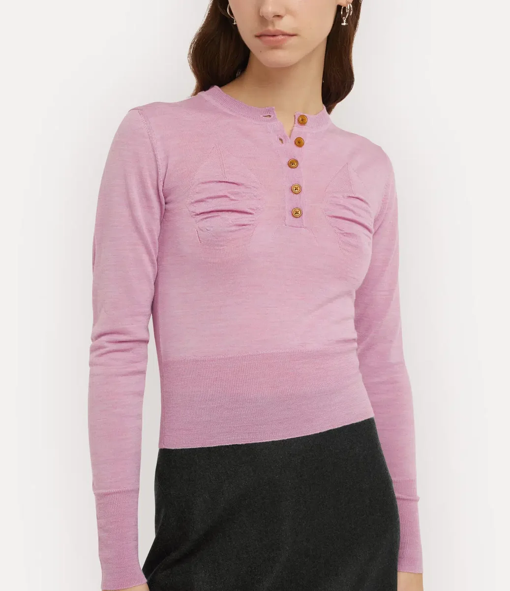 Unser Pullover Tit verfügt über skulpturale Strickdetails, die die Brust konturieren und an die avantgardistischen Silhouetten von Viviennes Herbst/Winter-Kollektion 1995 „Vive la Cocotte” erinnern. Das mit gerippten Bündchen verzierte Kleidungsstück ist auf der Rückseite mit einer gestickten Kugel verziert.