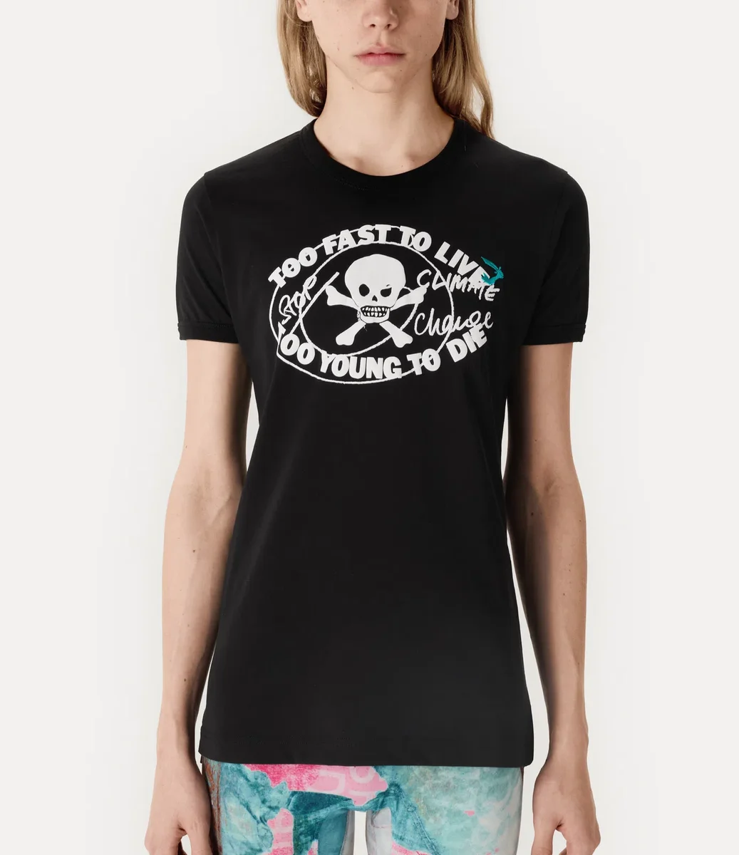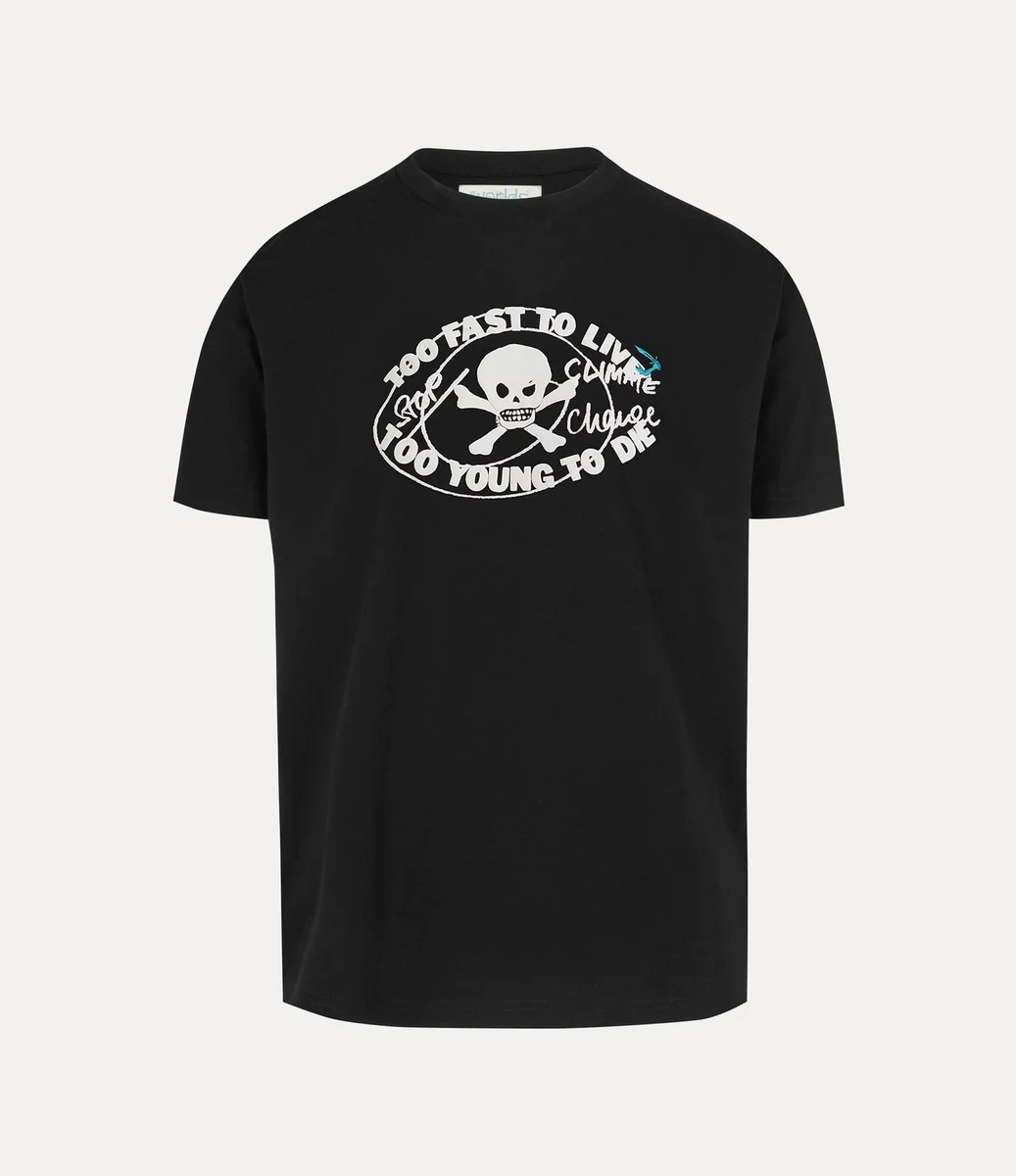 Unser Worlds End Classic T-Shirt ist aus leichter Baumwolle gefertigt und hat einen Rundhalsausschnitt, kurze Ärmel und einen geraden Saum. Das Design wird durch den Slogan „Too Fast to Live, Too Young to Die” vervollständigt, der von dem Schild unserer legendären Boutique stammt, die heute als Worlds‘ End bekannt ist.