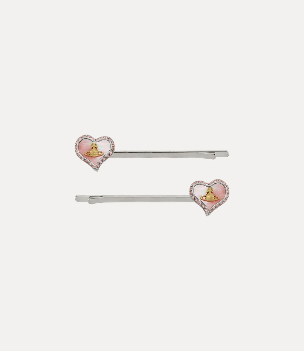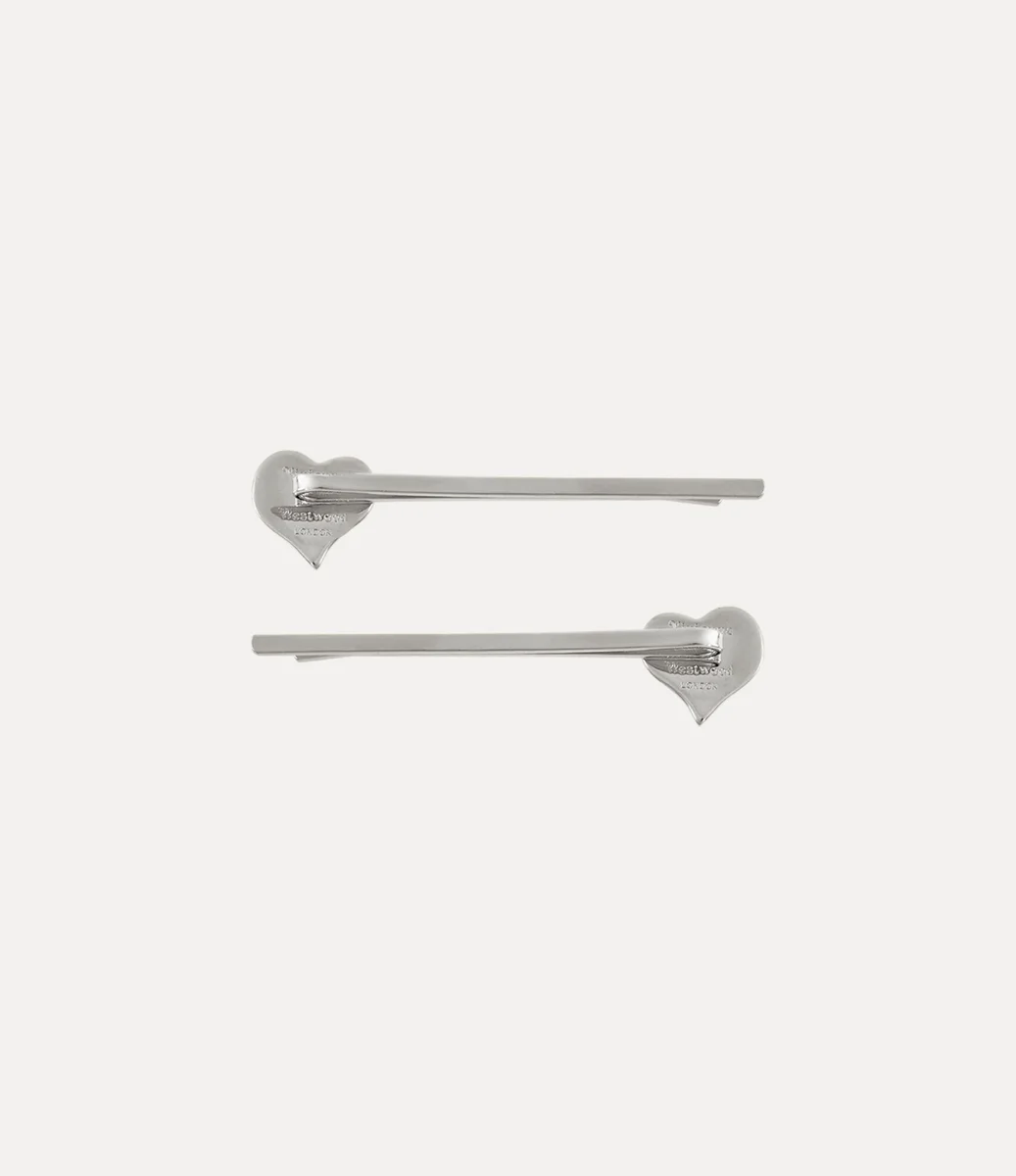 Unsere Petra Bobby Pins haben eine silberfarbene Silhouette und sind mit einem asymmetrischen Herzmotiv verziert, das an Viviennes Liebe zur Menschheit und zum Planeten erinnert. Das Stück zeigt in der Mitte eine Kugel, die Tradition symbolisiert, umgeben von den himmlischen Ringen des Saturn, die die Zukunft symbolisieren.