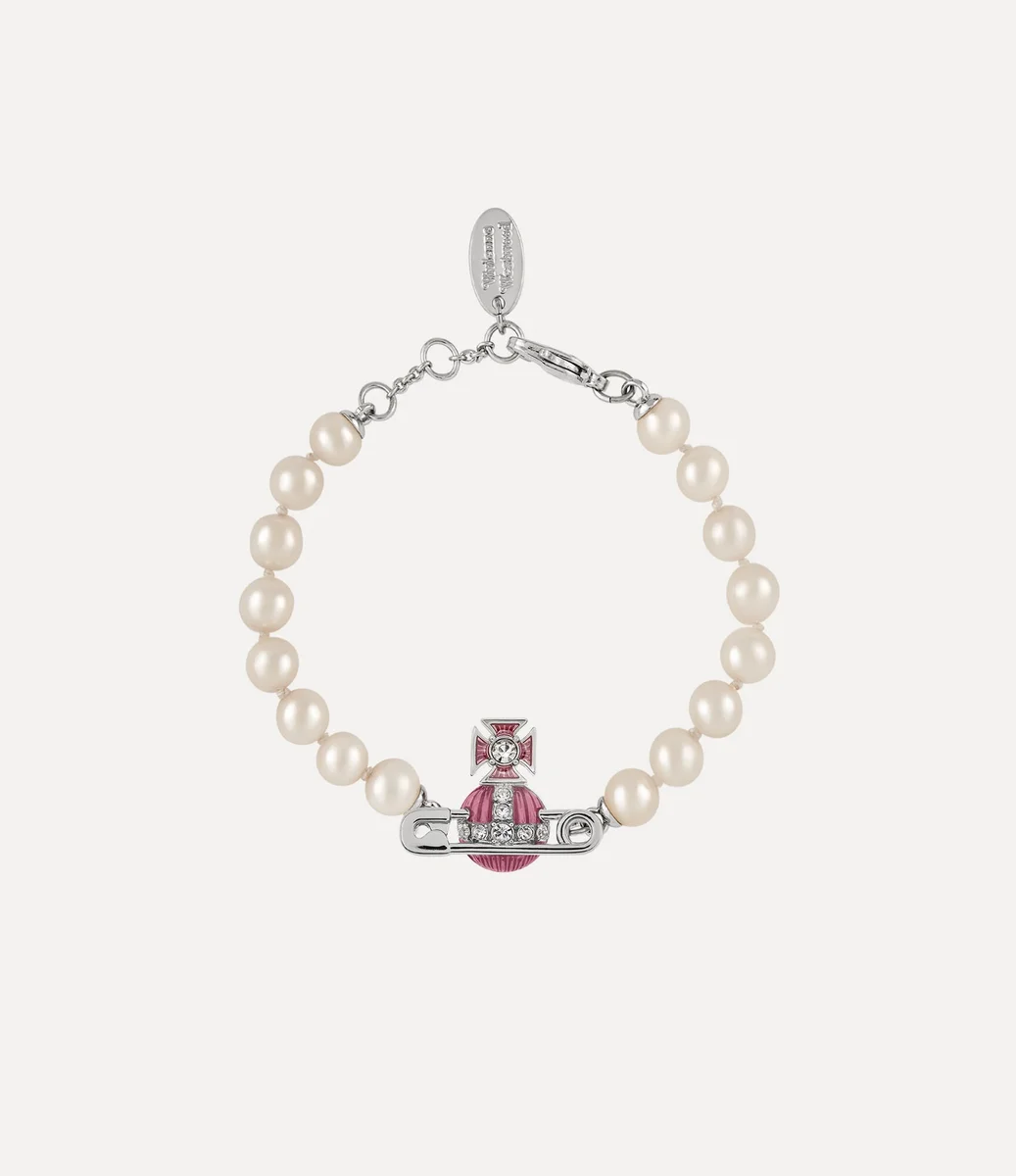 Das Kitty Pearl Armband besteht aus handgeknüpften Glasperlen, die von Vivienne Westwoods „Portrait”-Kollektion aus dem Jahr 1990 inspiriert sind. Die ikonische Kugelform ist mit einem Sicherheitsnadel-Motiv verziert, das mit durchscheinendem, rosafarbenem Emaille handbemalt ist, unter dem sich ein filigranes Metallmuster abzeichnet.