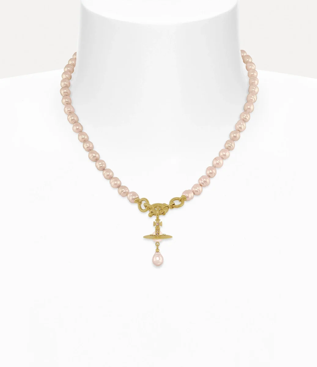 Perlen sind nach wie vor ein wesentliches Element der Ikonografie des Hauses und vermitteln ein Gefühl von Grandezza und Luxus. Unsere Aleksa-Halskette besteht aus einer Reihe handgeknüpfter Glasperlen, ergänzt durch ein mit Kristallen besetztes Kugelmotiv und einen barocken Perlentropfen.