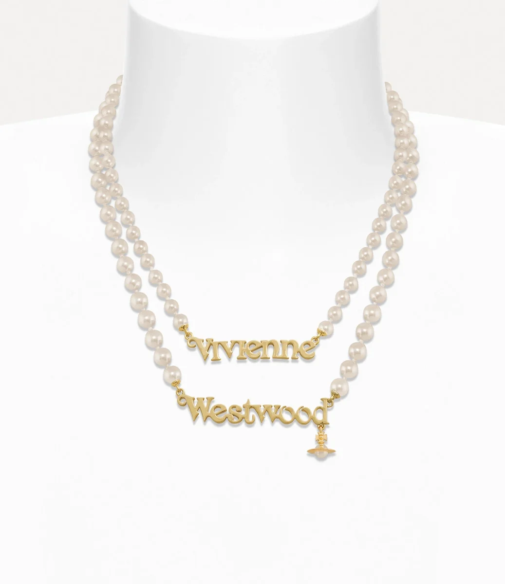 Die Amelia Halskette besteht aus zwei Reihen von Swarovski-Perlen auf Glasbasis, die mit den charakteristischen Schriftzugmotiven des Hauses in Goldfarbe verziert sind. Das Design wird mit einem sicheren Karabinerverschluss geschlossen und ist mit einem baumelnden Kugelanhänger versehen, der die Philosophie widerspiegelt, die Vergangenheit in die Zukunft zu tragen.