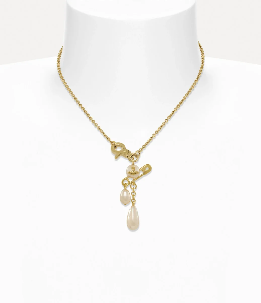 Die Claude Small Halskette verfügt über eine runde Perle mit einem zentralen Orb, der durch ein charakteristisches Sicherheitsnadel-Detail akzentuiert wird – eine Anspielung auf Viviennes punkinspirierten, nonkonformistischen Stil. Eine Perlentropfen und zarte Ketten-Details hängen elegant am Anhänger und verleihen dem Design Bewegung, während der von Hardware inspirierte Verschluss ein einfaches Schließen ermöglicht.