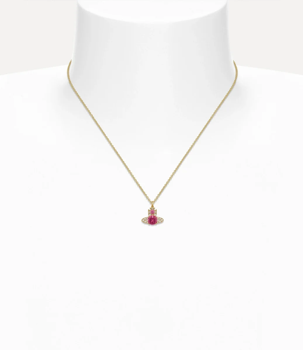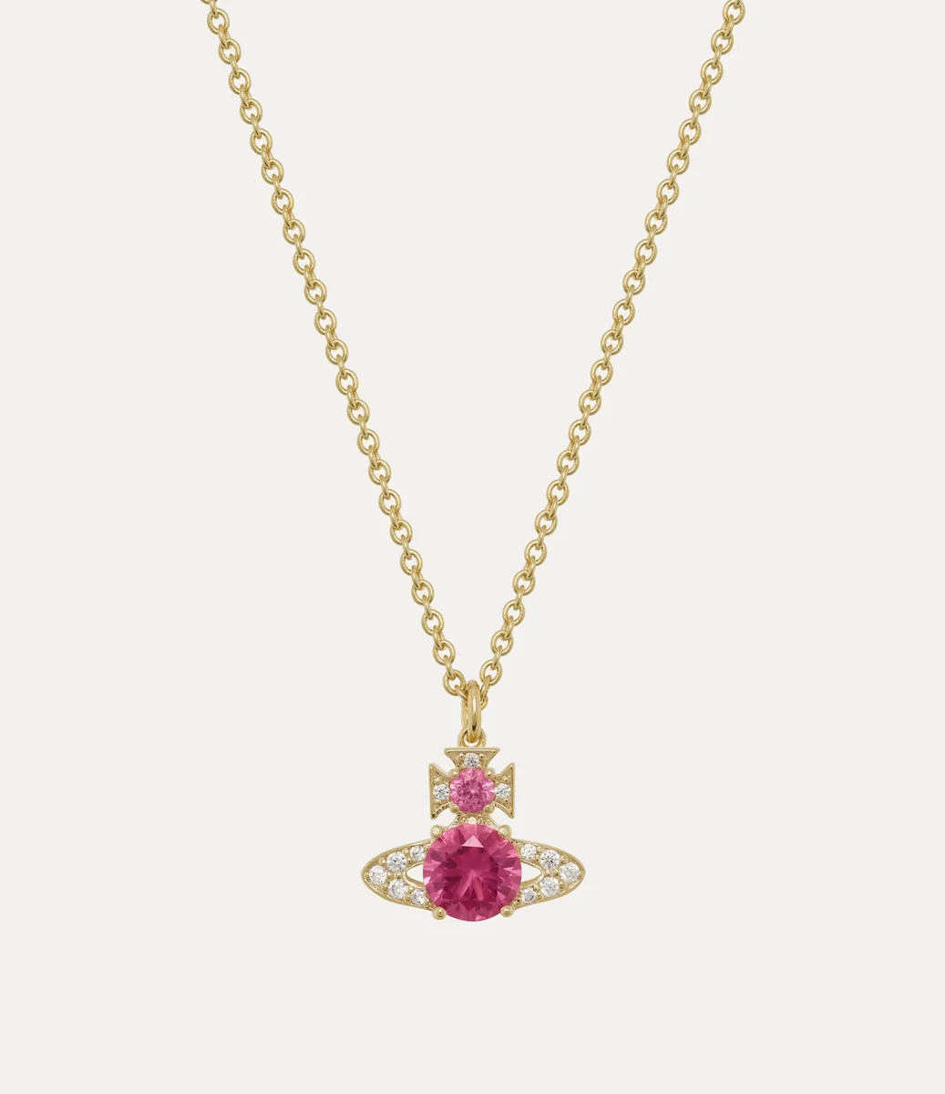 Unsere Ismene-Anhänger-Halskette kehrt in dieser Saison in einem polierten Goldton zurück, verziert mit rosa und weißen Kristallen in einer eleganten Pavé-Fassung. Das Design mit filigranen Ausschnitten entlang der Saturnringe wird durch ein ovales Etikett mit unserem Schriftzug am Karabinerverschluss abgerundet.