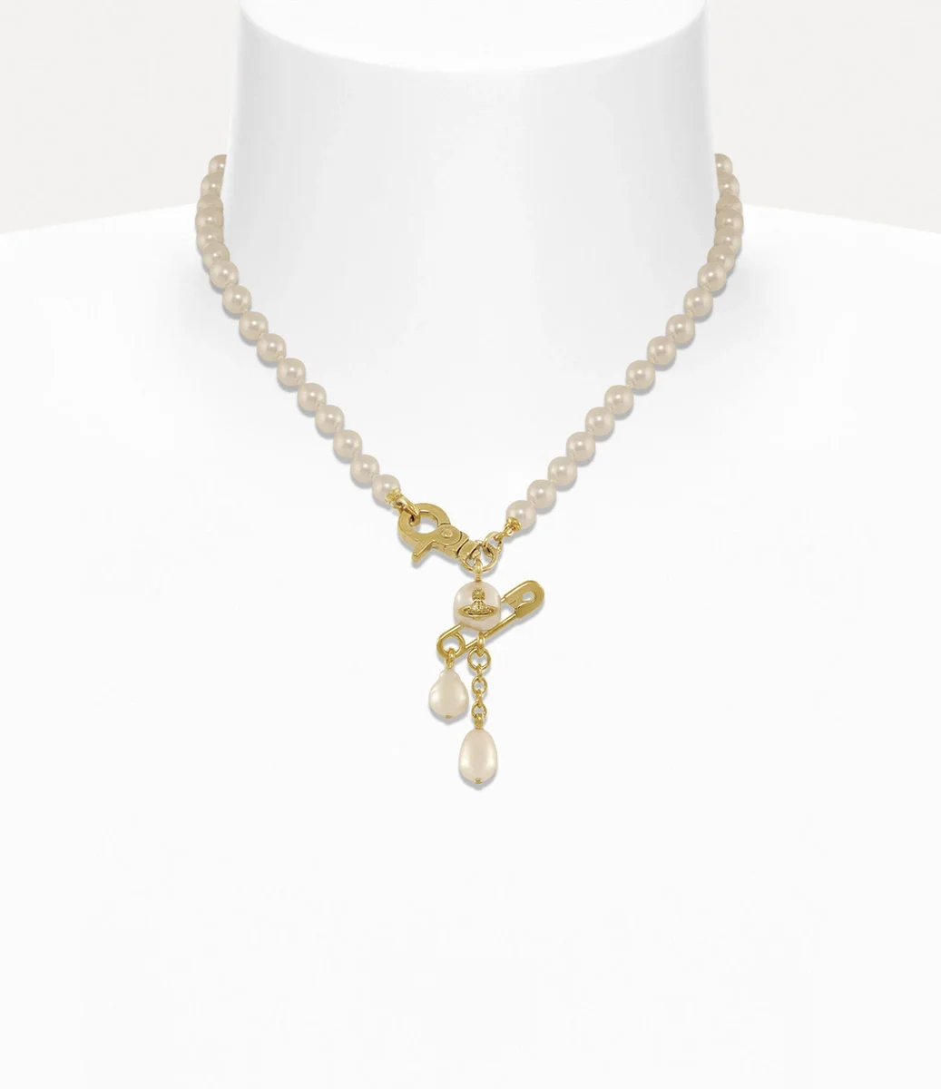 Die kleine Claude-Perlenkette aus dem Archiv wurde in dieser Saison mit einer einzelnen Reihe glitzernder Swarovski-Glasperlen aktualisiert und bietet ein abgerundetes Perlendetail in der Mitte, ergänzt durch eine klassische Sicherheitsnadel, die durch das Design gesteckt ist – eine Anspielung auf Viviennes charakteristische Punk-Ästhetik.