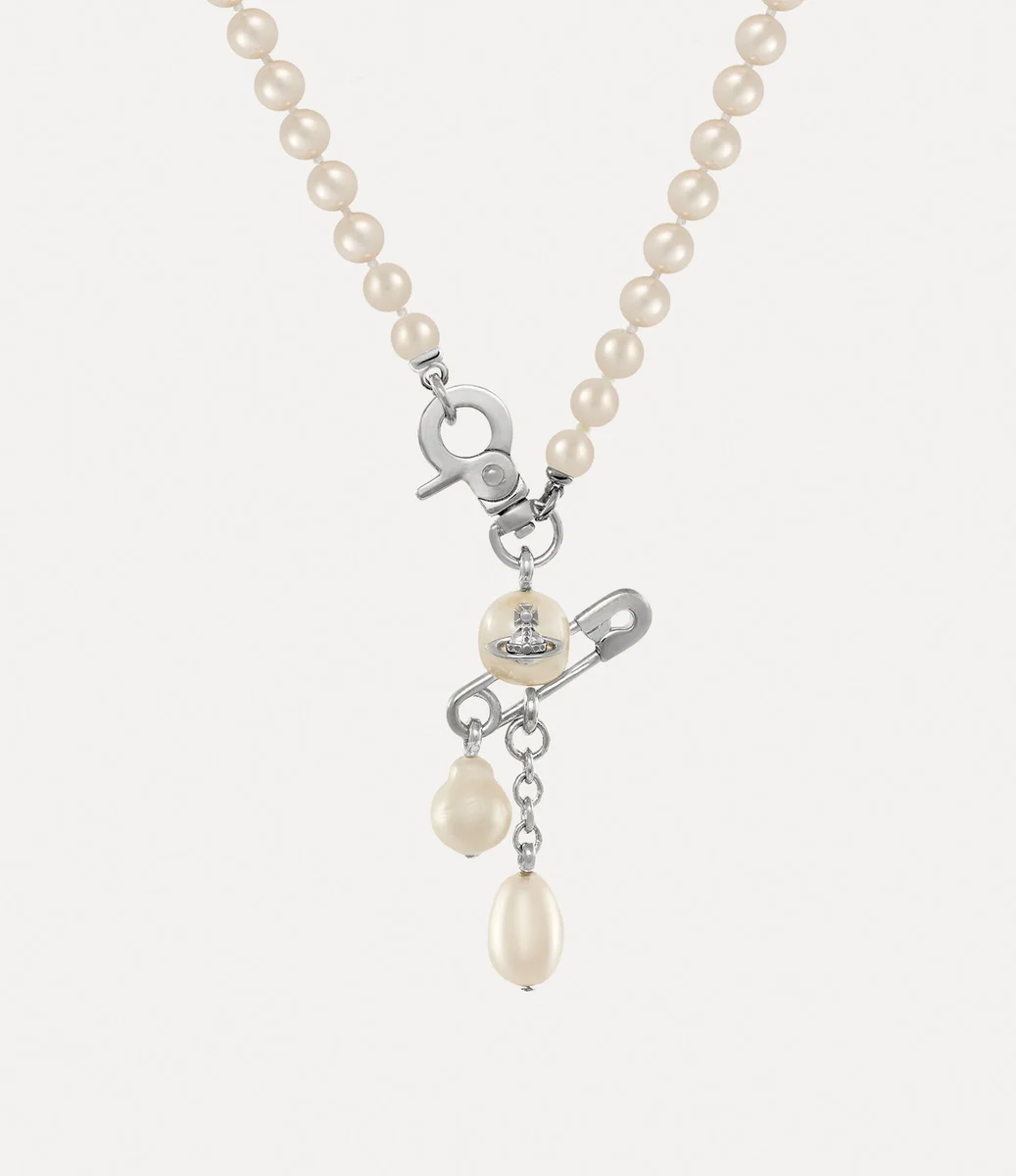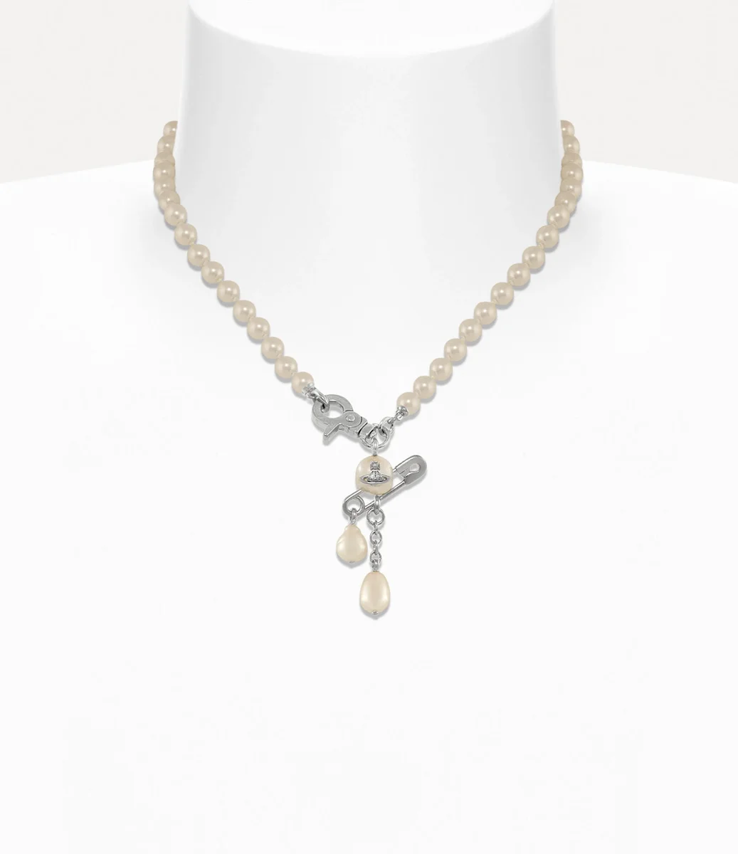 Die klassische Small Claude Pearl Halskette wurde in dieser Saison mit einer Reihe glitzernder Swarovski-Glasperlen aktualisiert und bietet ein rundes Perlendetail in der Mitte, ergänzt durch eine klassische Sicherheitsnadel, die durch das Design gesteckt ist – eine Anspielung auf Viviennes charakteristische Punk-Ästhetik.