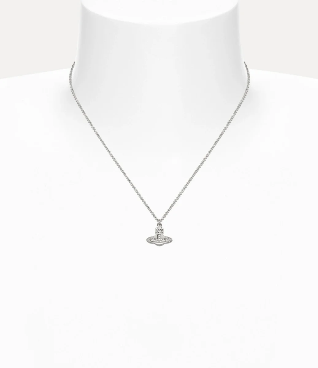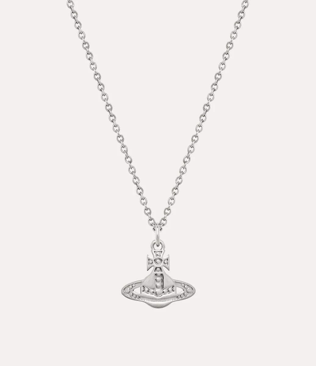 Unsere Marinetta-Anhänger-Halskette ist aus silberfarbenem Metall gefertigt und mit dem klassischen Kugelmotiv des Hauses verziert. Der Anhänger hat eine sanft geprägte, perlenartige Textur, die einen handgefertigten Eindruck vermittelt, während gravierte Details die Konturen des Kreuzes und des Saturnrings hervorheben.