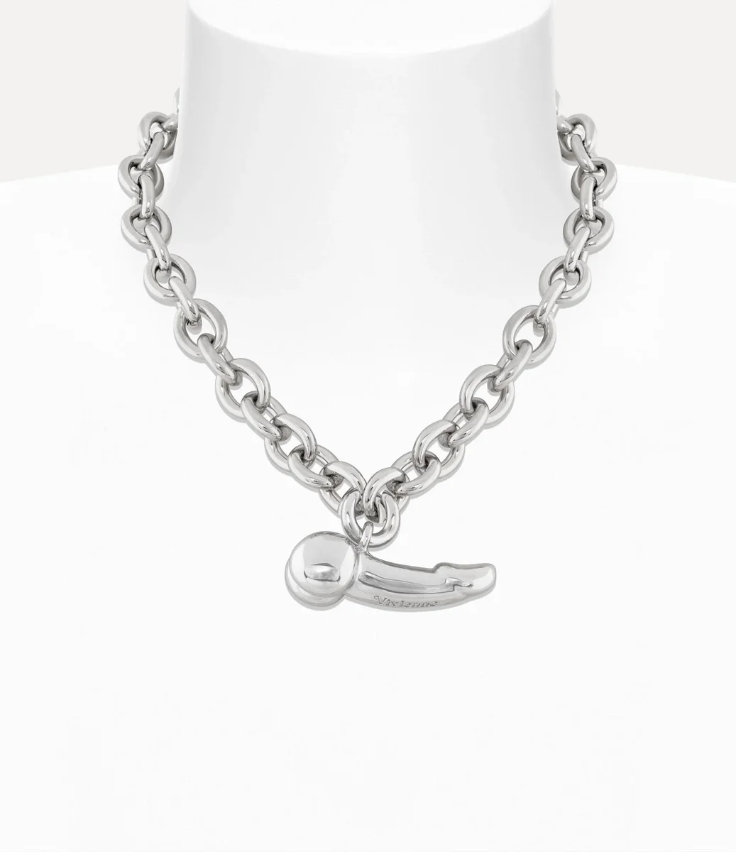 Die Penis-Halskette erinnert an Viviennes Bewunderung für die antike Kunst, in der dieses kühne Motiv oft als Symbol für Fruchtbarkeit oder Stärke verwendet wurde. Das Modell ist in polierter, silberfarbener Ausführung erhältlich, mit einer klobigen Kabelkette und einem sicheren Verschluss.