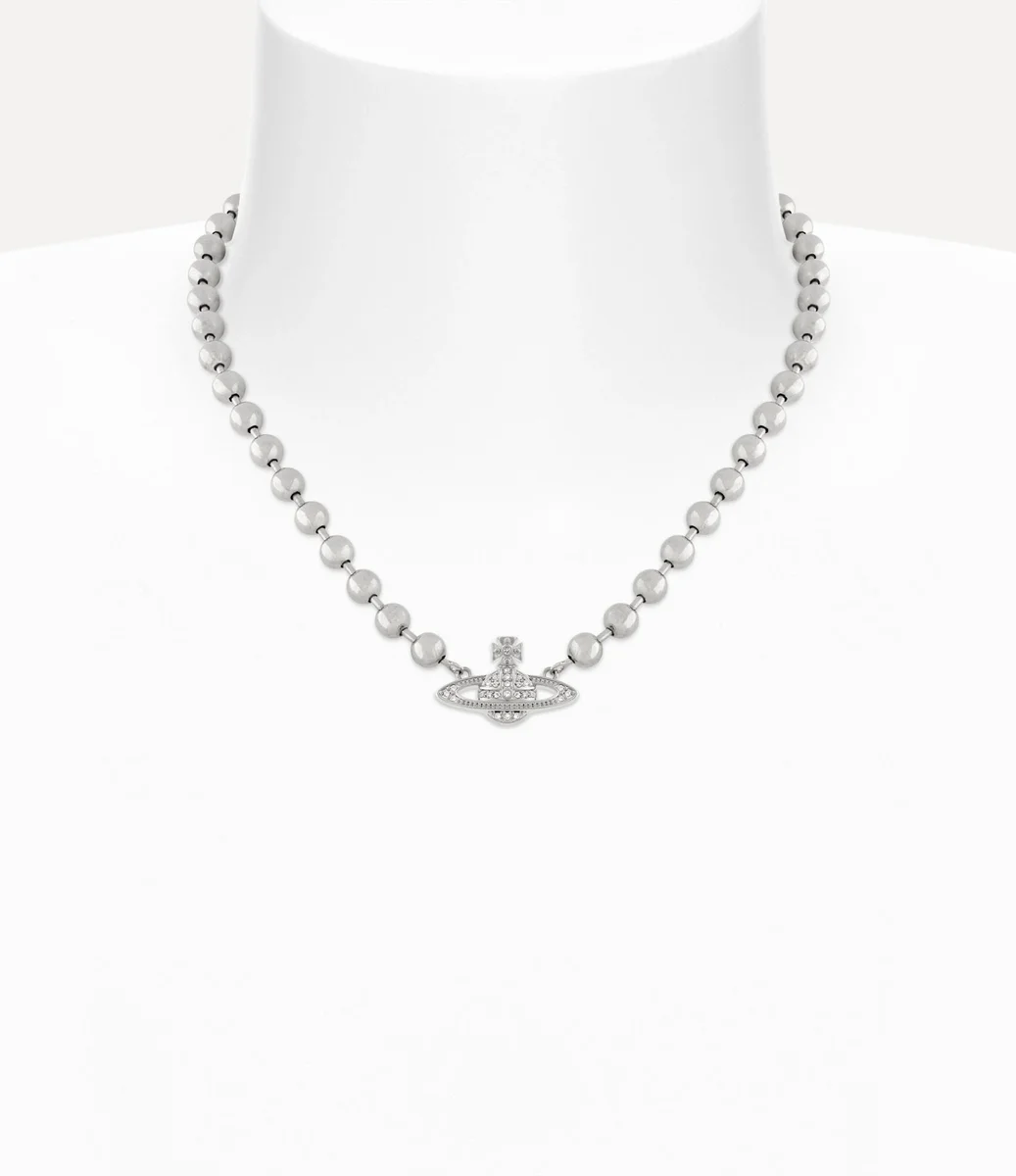 Der silberfarbene Mini-Basrelief-Halsreif von Vivienne Westwood Thames verfügt über eine elegante Kugelkette mit einem kristallbesetzten Kugelmotiv in der Mitte.