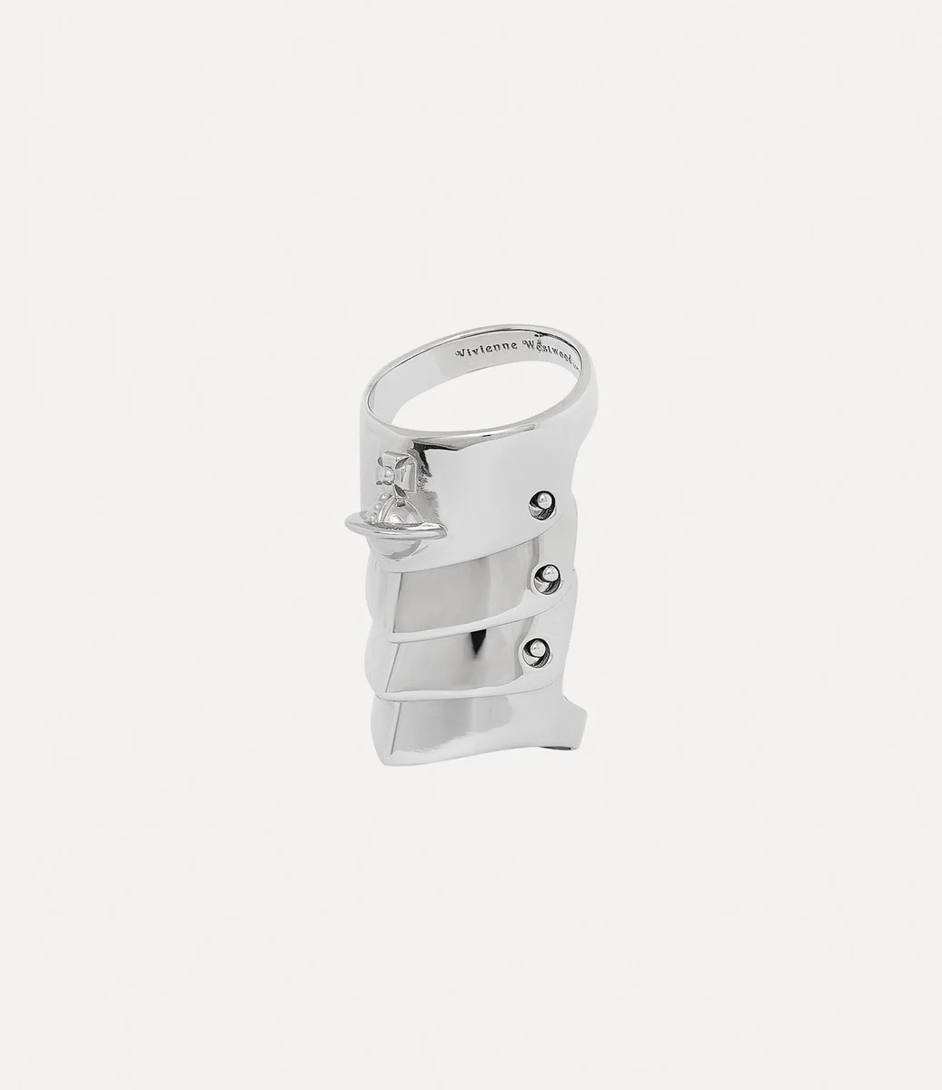 Die Silhouette des Armour Rings ist inspiriert von den plattierten, an Rüstungen angelehnten Jacken aus der Vivienne Westwood „Time Machine”-Kollektion von 1988 – ein Spiegelbild von Viviennes tiefer Faszination für die Wallace Collection. Das Schmuckstück besteht aus vier sich überlappenden, platinierten Silberteilen, die mit unserem charakteristischen Orb-Motiv verziert sind und die Philosophie verkörpern, die Vergangenheit in die Zukunft zu tragen.
