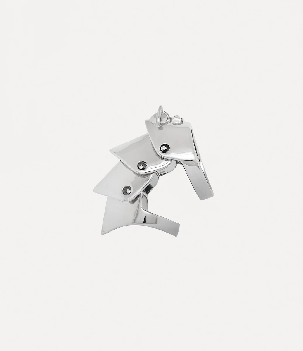 Die Silhouette des Armour-Rings ist inspiriert von den plattierten, an Rüstungen angelehnten Jacken aus der „Time Machine”-Kollektion von Vivienne Westwood aus dem Jahr 1988 – ein Spiegelbild von Viviennes tiefer Faszination für die Wallace Collection. Das Schmuckstück besteht aus vier sich überlappenden, platinierten Silberteilen, die mit unserem charakteristischen Kugelmotiv verziert sind und die Philosophie verkörpern, die Vergangenheit in die Zukunft zu tragen.
