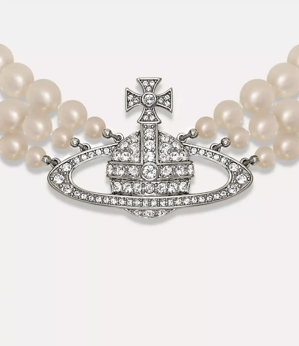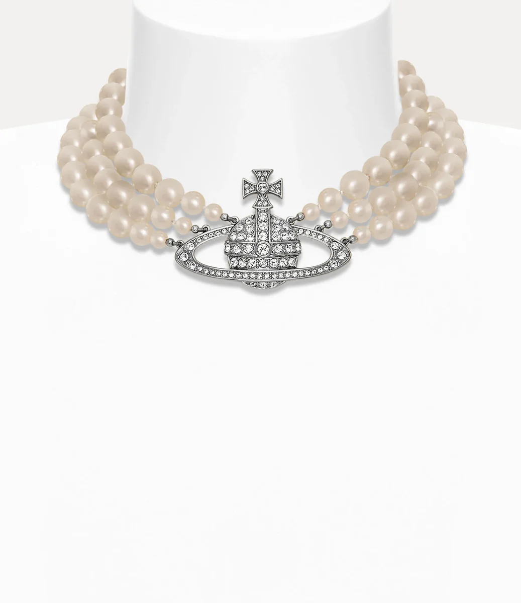 Der dreireihige Perlen-Basrelief-Halsreif, der erstmals in unserer ikonischen „Portrait”-Kollektion von 1990 erschien, ist von klassischem Perlenschmuck inspiriert und vereint Viviennes unverwechselbaren Ansatz, Punk-Ästhetik mit historischen Einflüssen zu verbinden. Das Design zeichnet sich durch einen zentralen Basrelief-Reif aus, der mit weißen Kristallen verziert ist und die Vision des Hauses verkörpert, die Vergangenheit in die Zukunft zu übertragen.