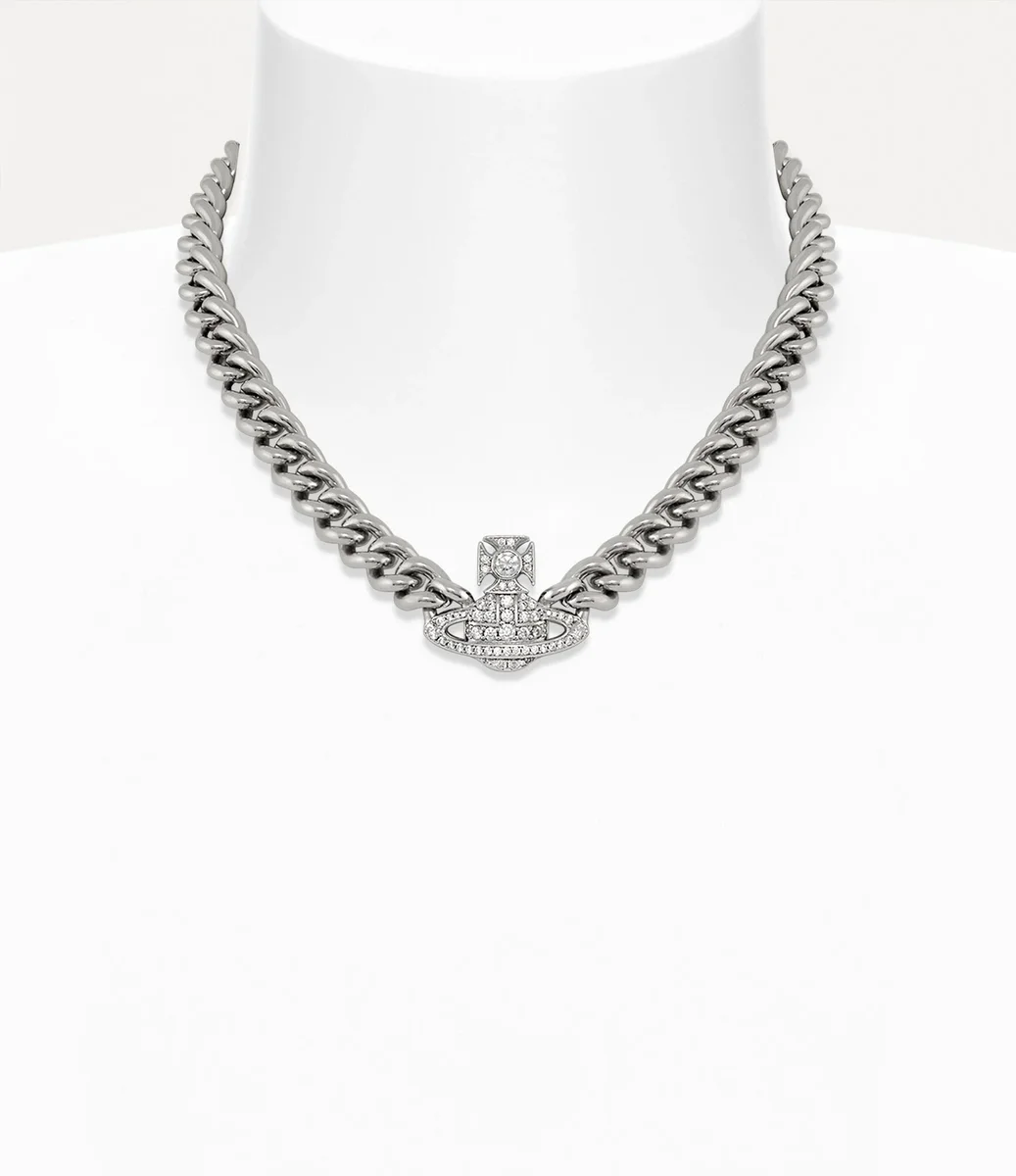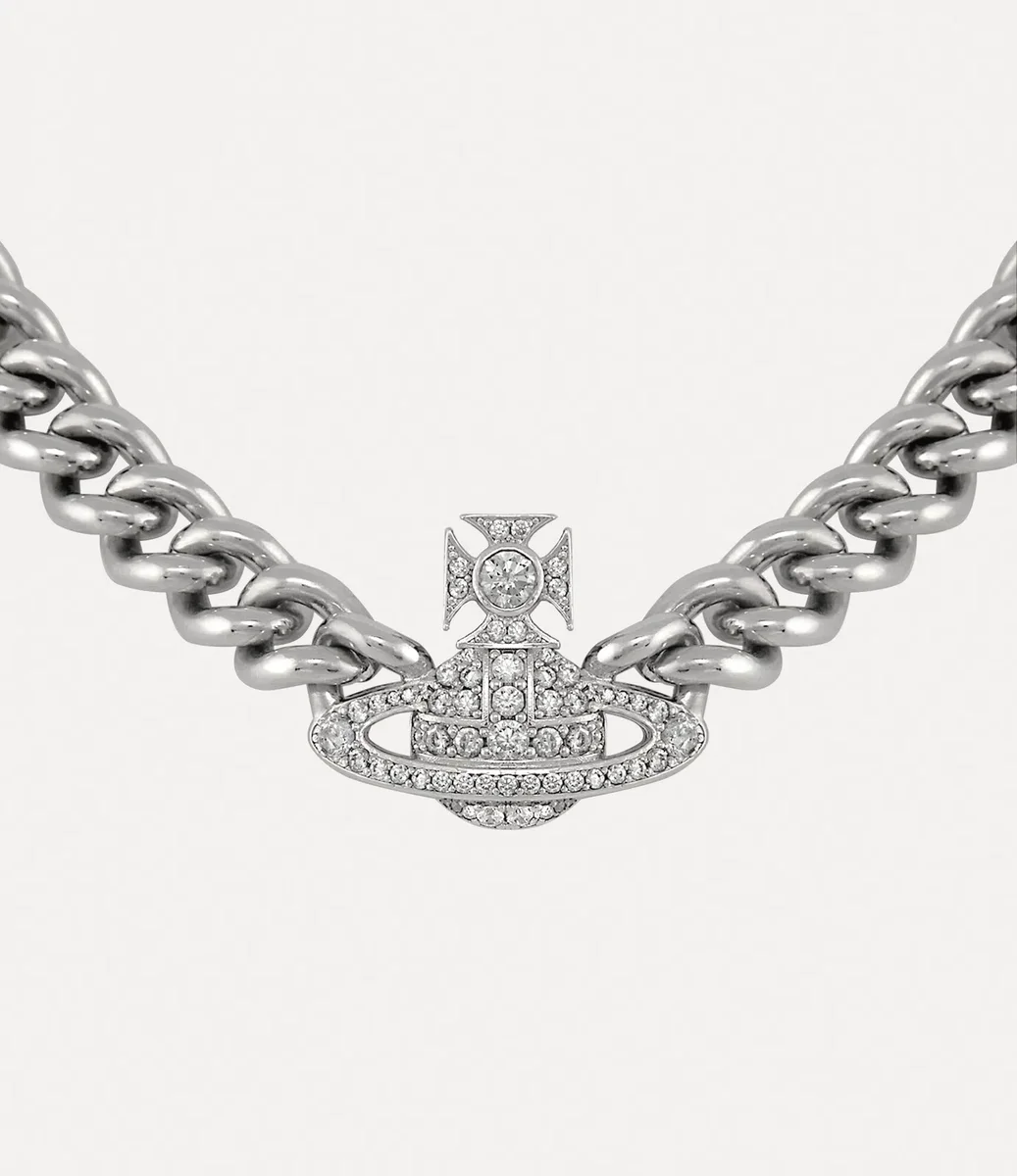 Unser Graziella Small Choker zeigt unser ikonisches Kugelmotiv in der Mitte des Designs und verkörpert Viviennes Vision, Tradition in die Zukunft zu tragen. Das Stück ist mit weißen Zirkonia-Kristallen und einer silberfarbenen Beschichtung verziert und wird durch eine einzelne Panzerkette ergänzt.