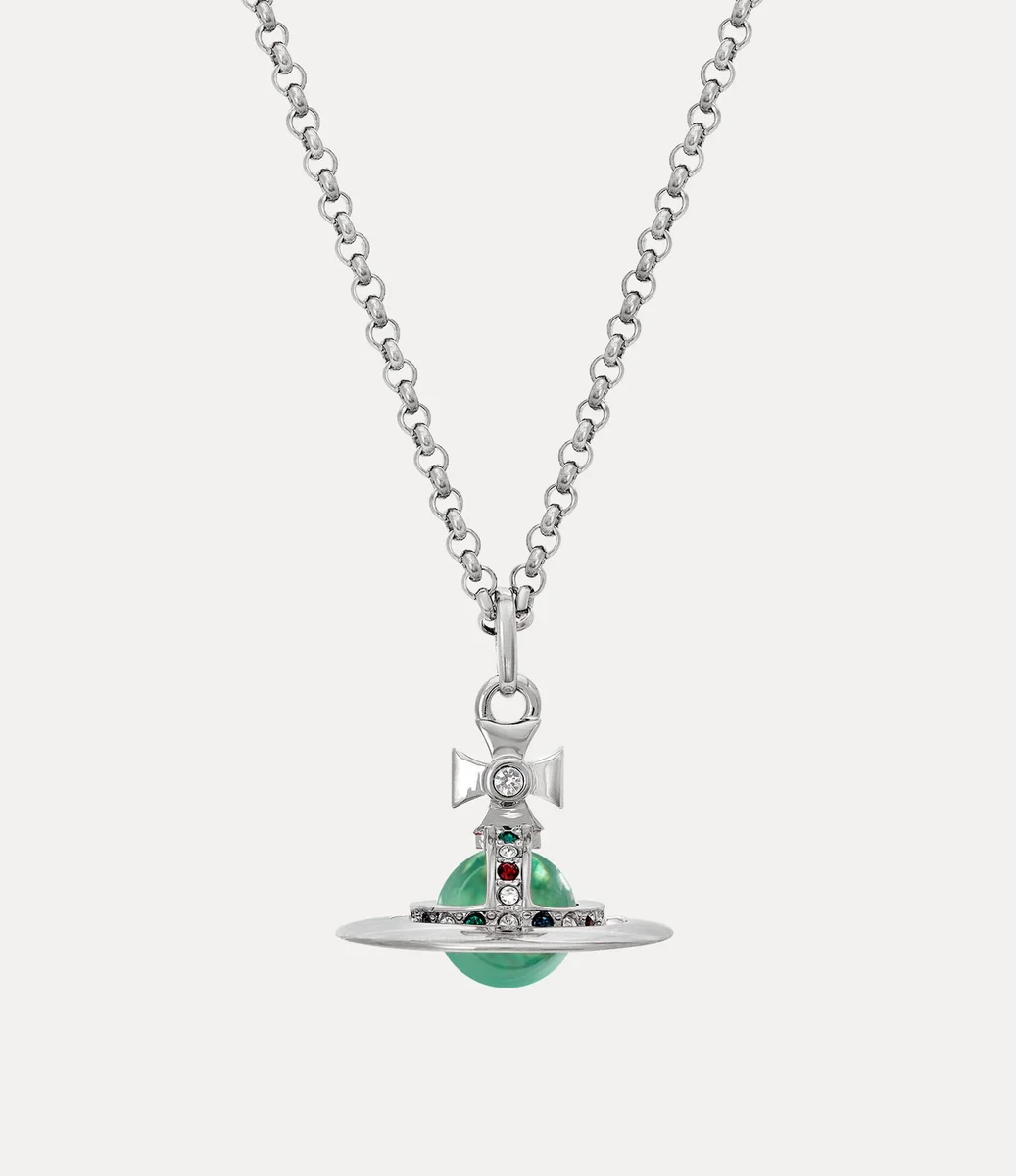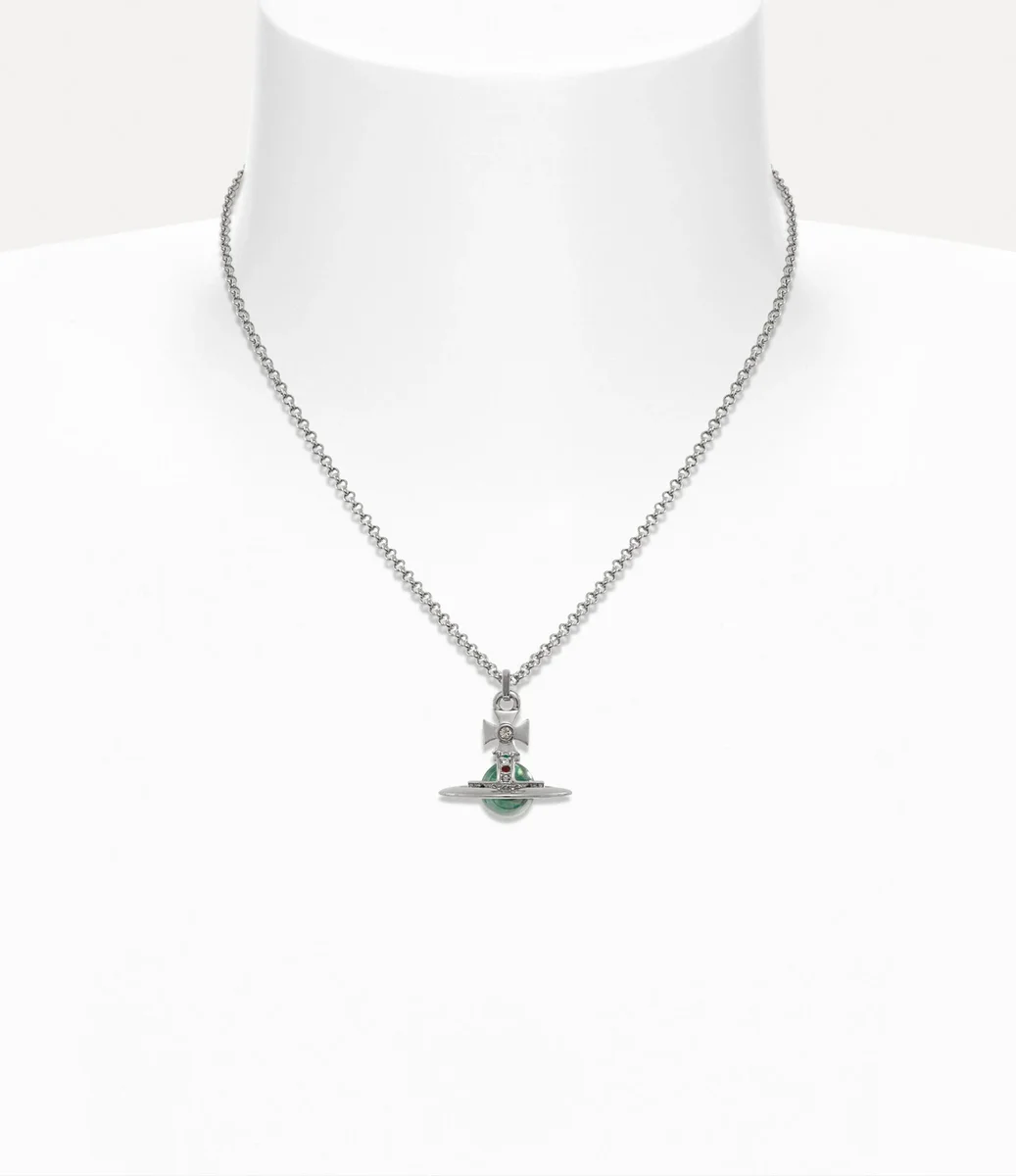 Unsere neue Halskette mit kleinem Kugelanhänger ist ein charakteristisches Modell unseres Hauses und verfügt über einen grünen kugelförmigen Glasstein, der durch einen sicheren Karabinerverschluss ergänzt wird. Der dreidimensionale Kugelanhänger ist mit glitzernden Kristalldetails in leuchtenden Farben verziert und erinnert an die Idee, die Vergangenheit in die Zukunft zu übertragen.