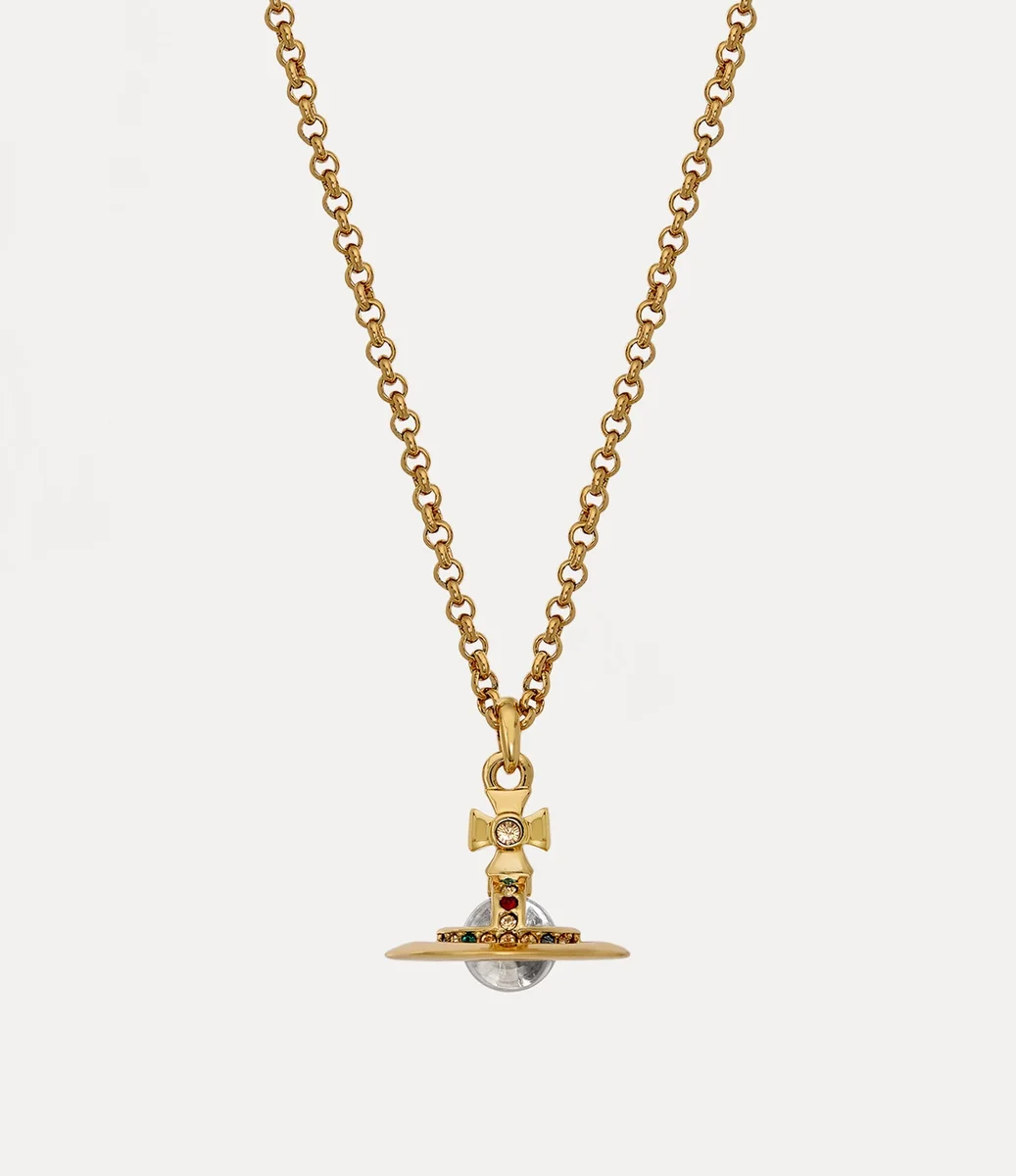 Unsere neue Petite Orb-Anhänger-Halskette wurde in dieser Saison mit einer goldfarbenen Beschichtung aktualisiert. Das mit glitzernden farbigen Kristalldetails verzierte Design enthält unsere charakteristische dreidimensionale Kugel in der Mitte der Kette – ein Synonym für Viviennes Vision, Tradition in die Zukunft zu übertragen.