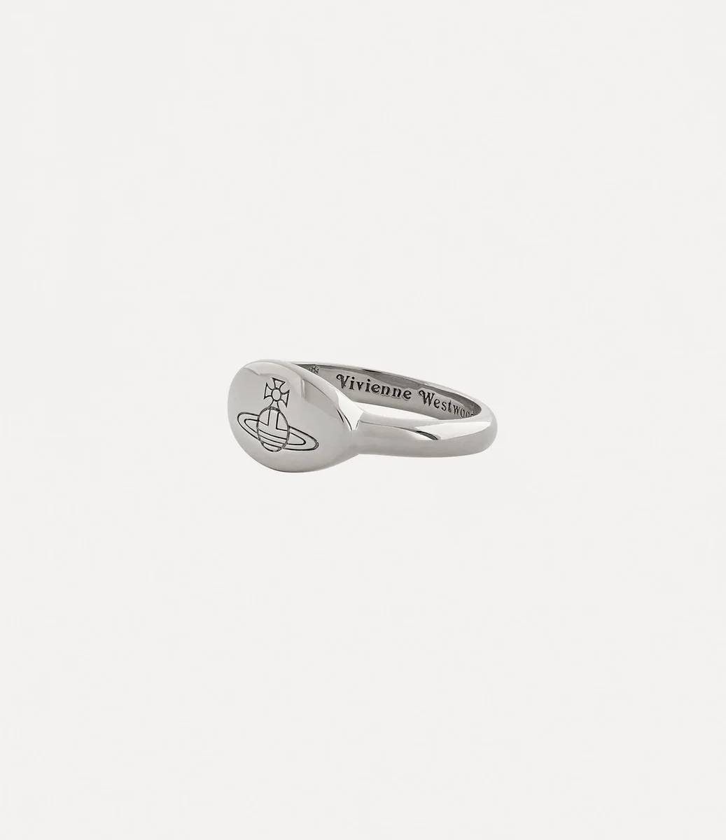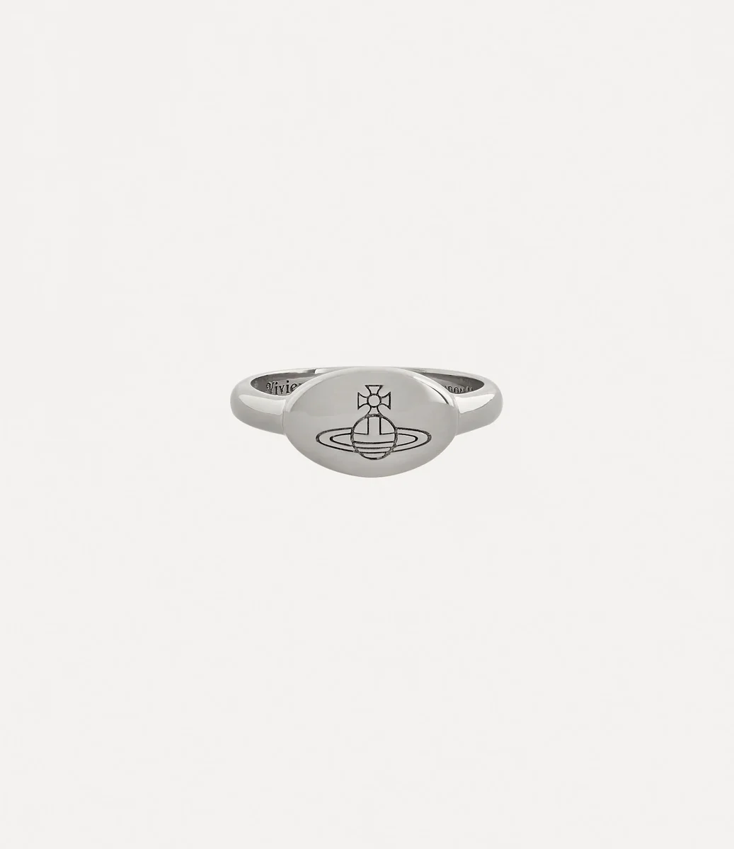 Unser Tilly-Ring hat eine klassische Siegelform, ist aus recyceltem Silber gefertigt und mit einer polierten platinfarbenen Beschichtung versehen. In der Mitte befindet sich das gravierte Orb-Motiv, das mit schwarzen Emaille-Details handbemalt ist und Viviennes Vision widerspiegelt, Tradition in die Zukunft zu tragen.
