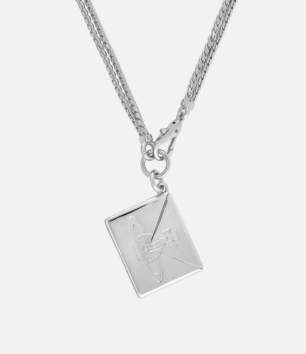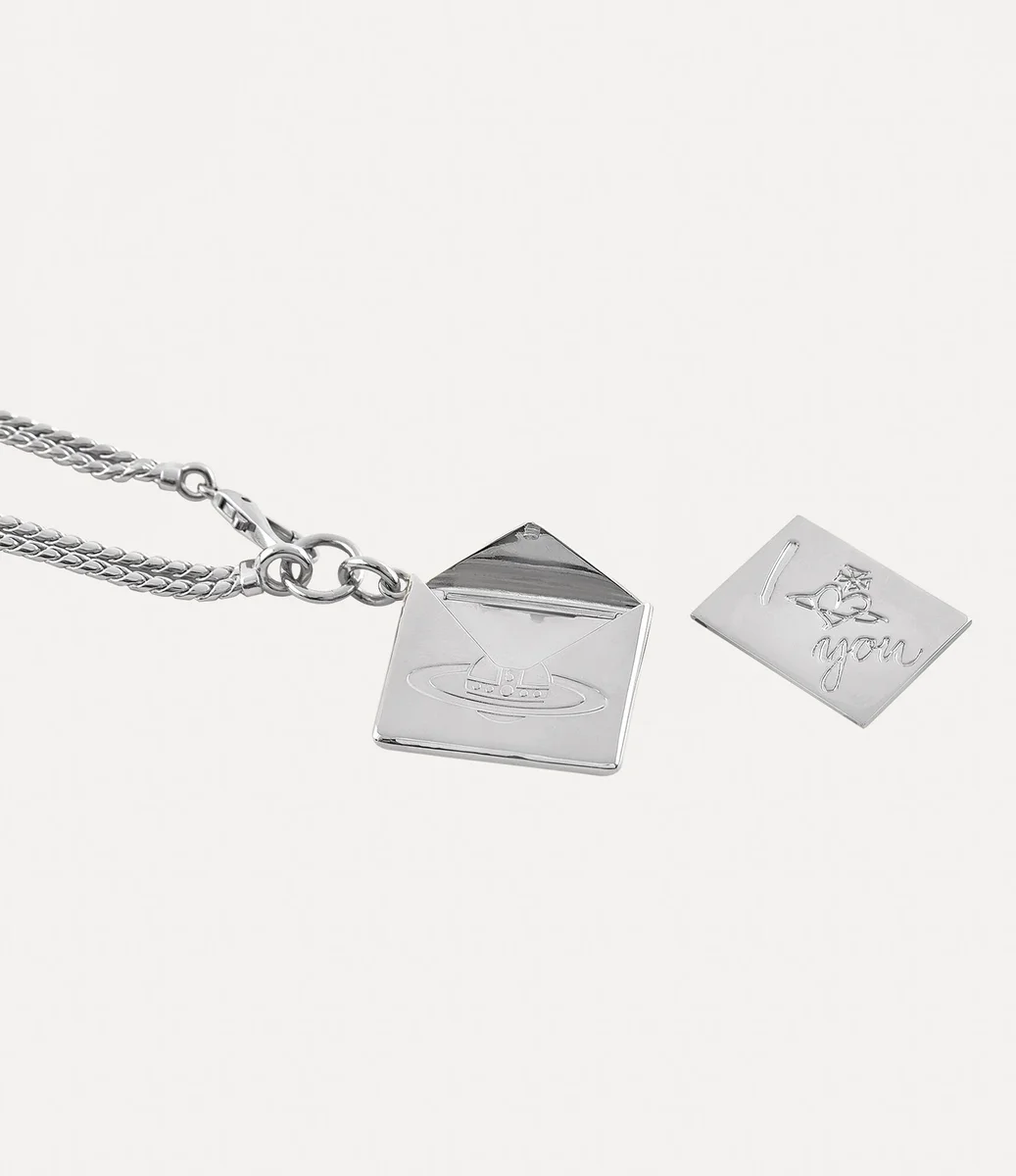 Unsere Valentine’s Envelope Pendant Halskette verfügt über eine doppelte Ketten-Silhouette aus silberfarbenem Metall, die mit schwarzen Patina-Details verziert ist. Auf der Vorderseite befindet sich unser charakteristisches Kugel-Motiv, ein Symbol für Viviennes Vision, Tradition in die Zukunft zu tragen, während auf der Rückseite die Vivienne Westwood Flagship-Boutique eingraviert ist. Die Halskette lässt sich öffnen und enthüllt einen gegossenen Brief mit der herzlichen Botschaft „I love you“.