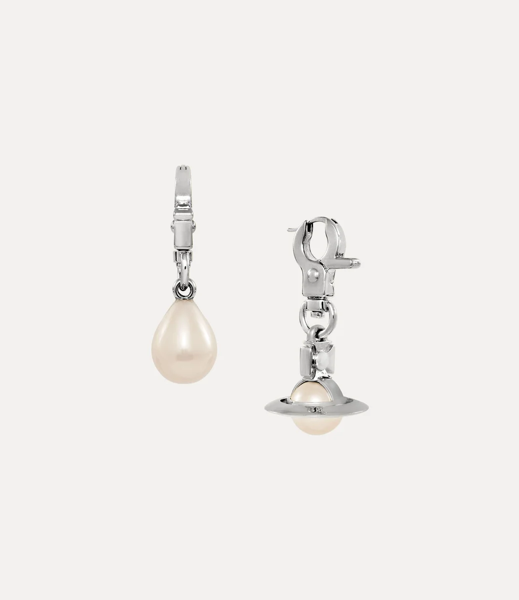 Unsere Claude-Ohrringe zeichnen sich durch ein asymmetrisches Design aus, das durch eine silberfarbene Beschichtung noch verstärkt wird. Diese Ohrringe sind mit einer vollständig aus Metall gefertigten Kugel verziert, die Viviennes Vision der Verschmelzung von Tradition und Zukunft symbolisiert, und werden durch einen klassischen Perlenanhänger ergänzt, der an einem markanten, von Drehverschlüssen inspirierten Verschluss hängt.