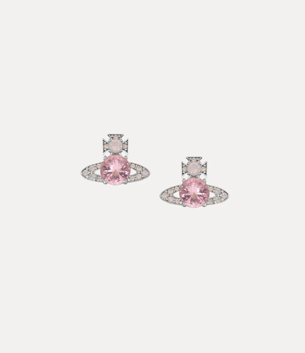 Unsere Ismene Ohrringe sind aus poliertem silberfarbenem Metall gefertigt und mit einem großen, facettierten rosa Edelstein in der Mitte jedes Ohrrings verziert. Der Saturnring des Kugel-Designs ist mit zarten rosa Kristallen verziert, während das Kreuz an der Oberseite mit einem milchigen, schillernden Edelstein besetzt ist.