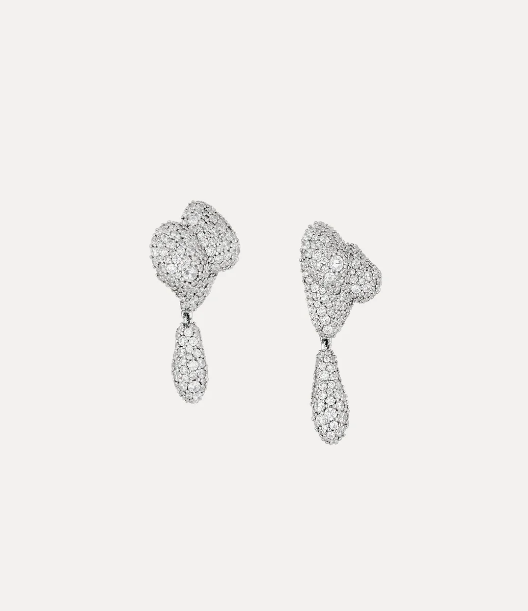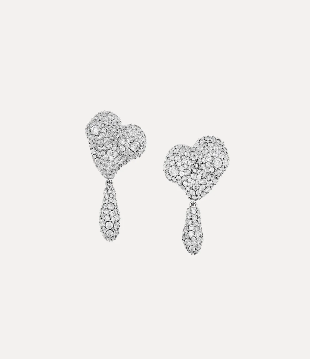 Unsere Mimosa Pave Ohrringe greifen das klassische asymmetrische Herzmotiv des Hauses wieder auf und erinnern an Viviennes Liebe zur Menschheit und zum Planeten. Das mit farblich abgestimmten Kristalldetails besetzte Schmuckstück ist filigran zu einer spitzen Form geformt und mit einem hängenden Tropfen versehen.