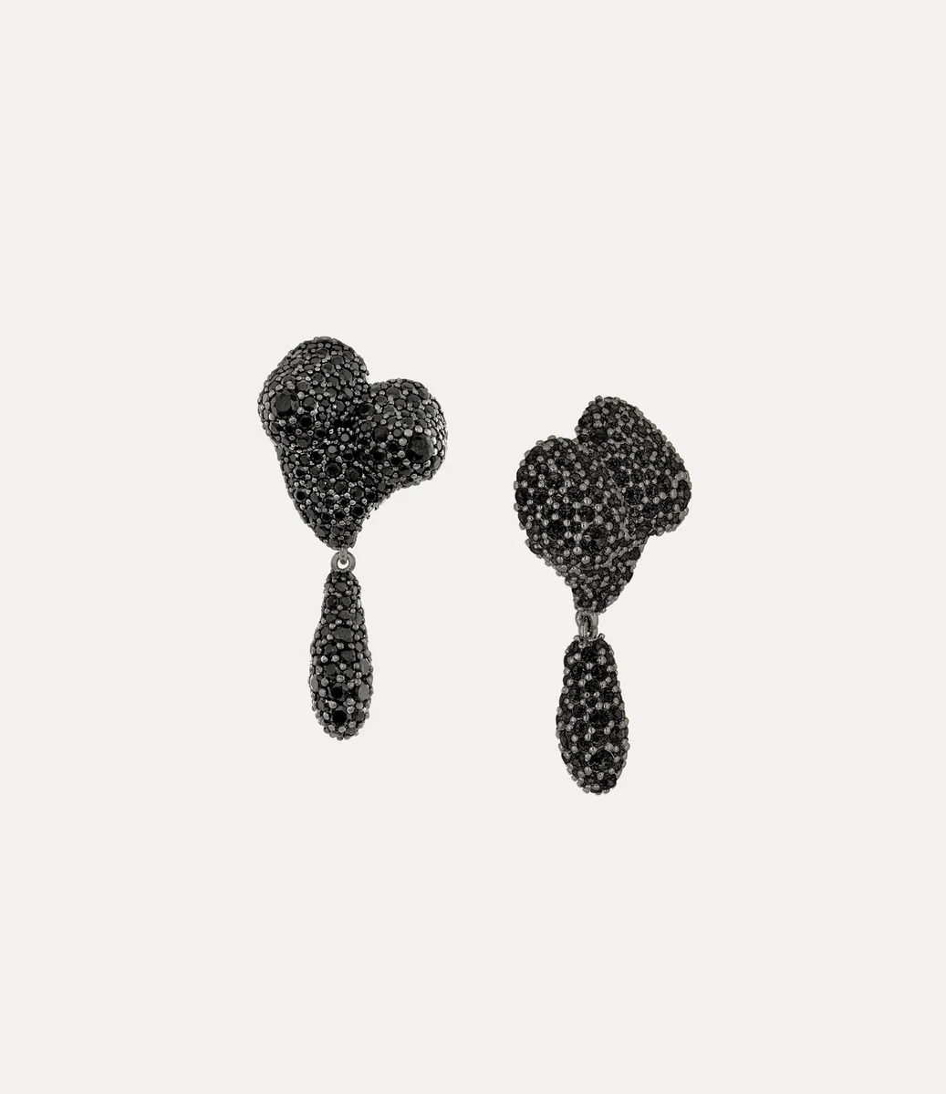 Unsere Mimosa Pave Ohrringe lassen das klassische asymmetrische Herzmotiv des Hauses wieder aufleben und erinnern an Viviennes Liebe zur Menschheit und zum Planeten. Das mit schwarzen Kristalldetails besetzte Schmuckstück ist filigran zu einer spitz zulaufenden Spitze geformt und mit einem hängenden Tropfen versehen.