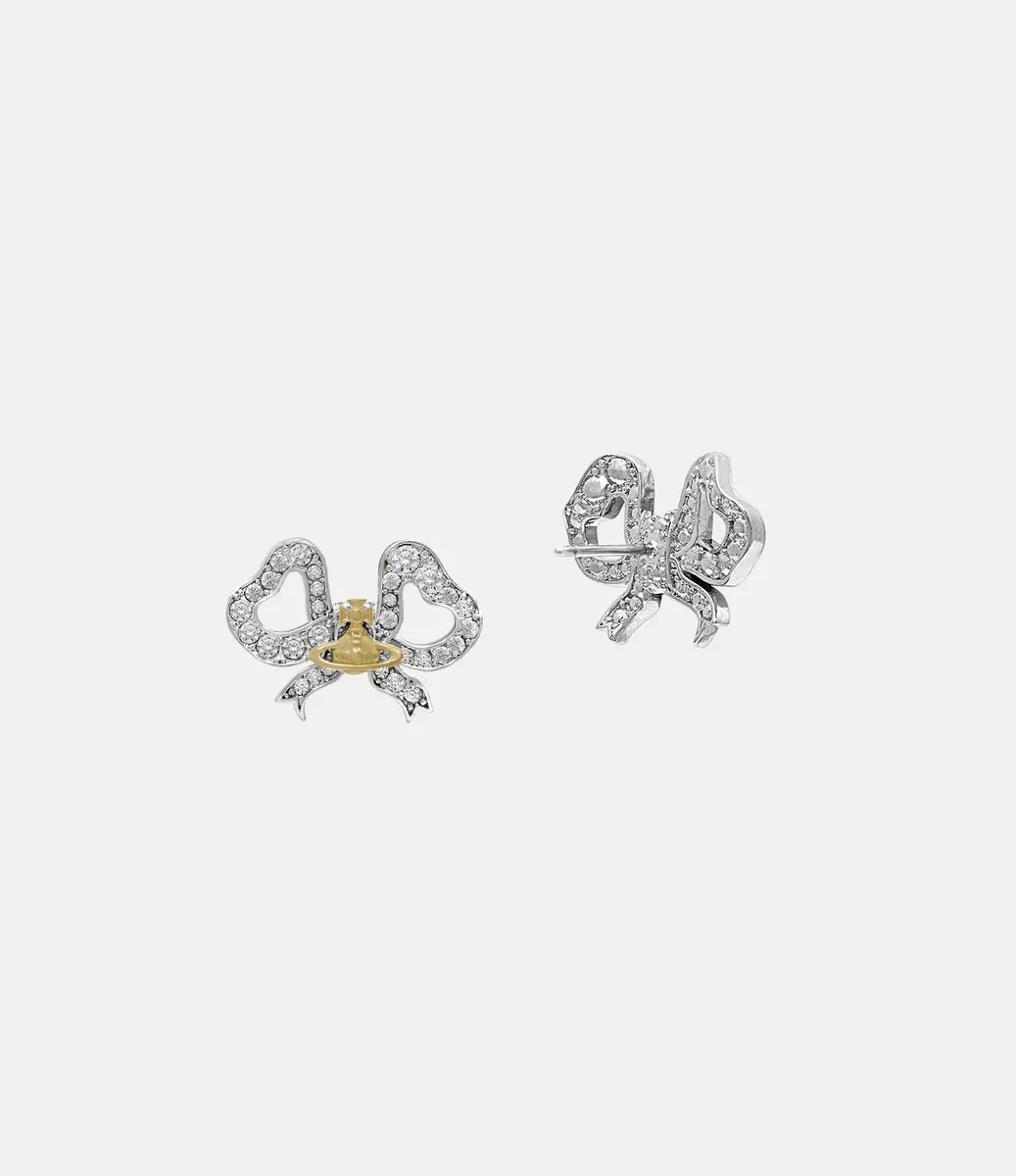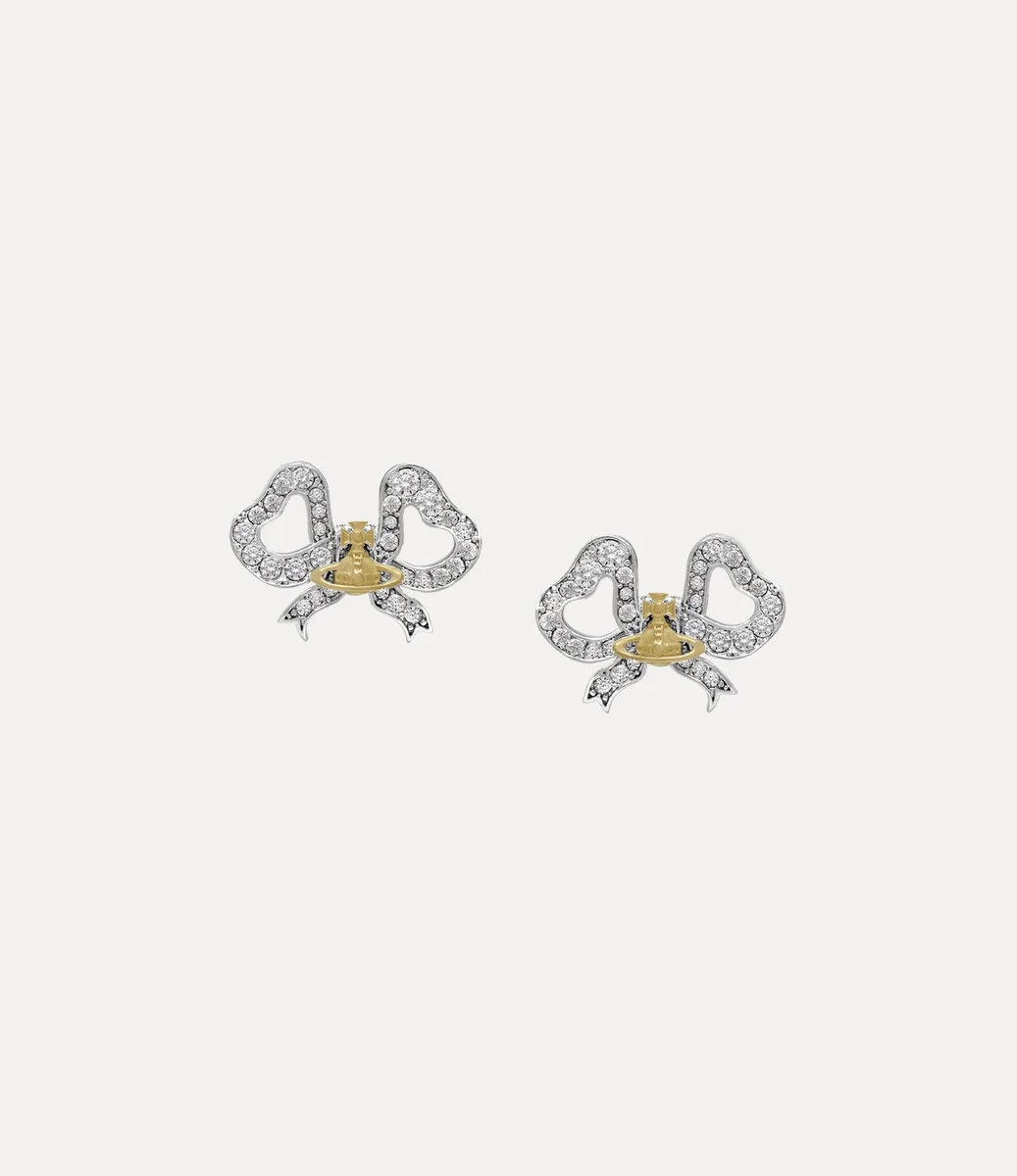 Die Bogenform ist zu einem Markenzeichen des Hauses geworden und taucht seit jeher in vielen Kollektionen auf. Die Rigoberta Ohrringe zeichnen sich durch eine aufwendige Silhouette im georgianischen Stil aus, die mit funkelnden weißen Kristallen verziert ist, die elegant ein kontrastierendes Kugelmotiv in der Mitte umrahmen – ein Synonym für Viviennes Vision, Tradition in die Zukunft zu tragen.