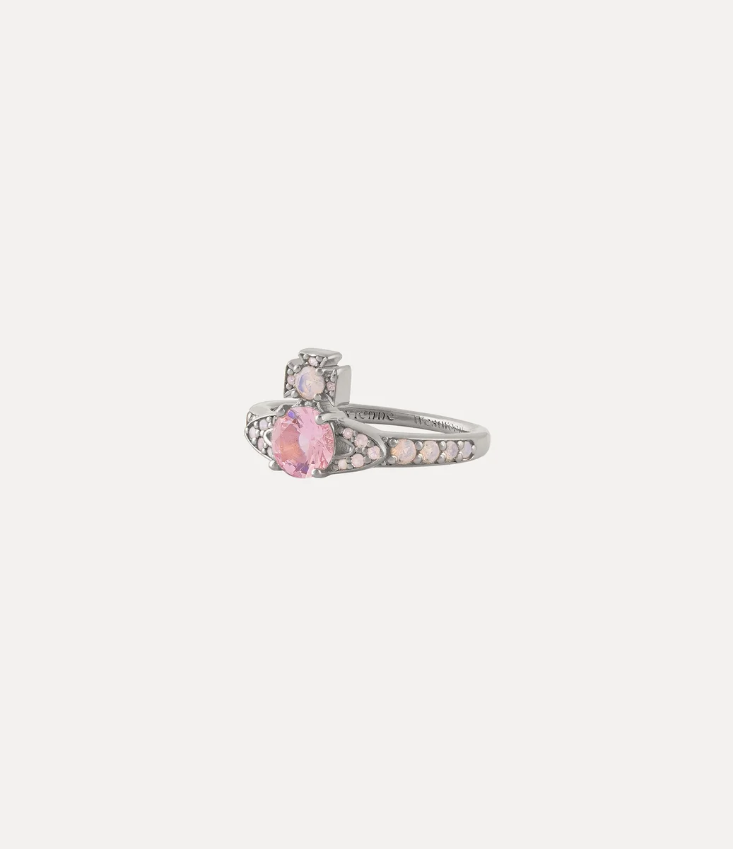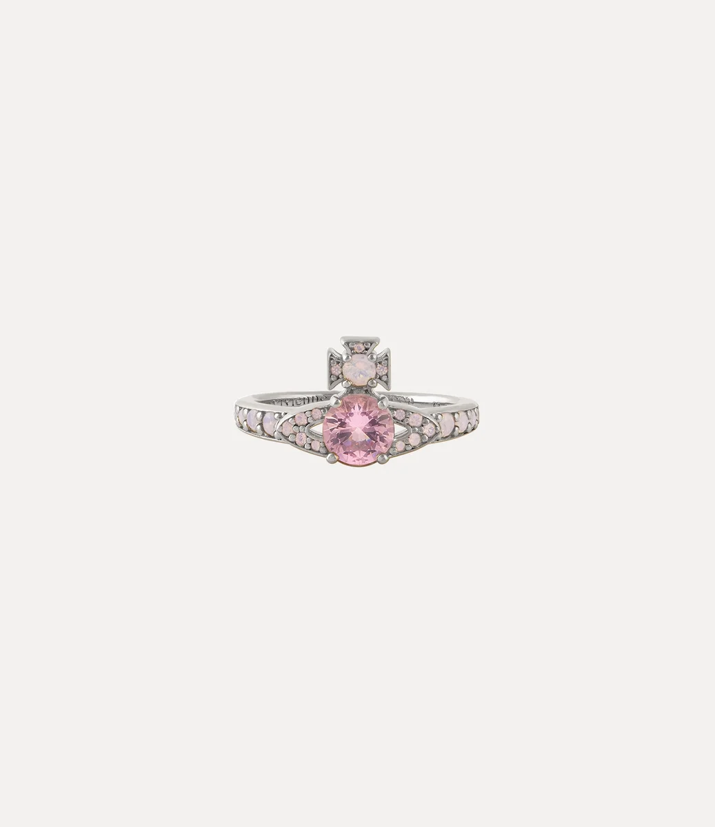 Der Ismene-Ring wird in dieser Saison aus recyceltem Silber angeboten, mit einer polierten, platinfarbenen Oberfläche und einem mit Kristallen besetzten schmalen Band. Das Stück verfügt über einen glitzernden rosa Kristall in der Mitte der kugelförmigen Fläche, der Tradition symbolisiert, umgeben von den himmlischen Ringen des Saturn, die die Zukunft repräsentieren.
