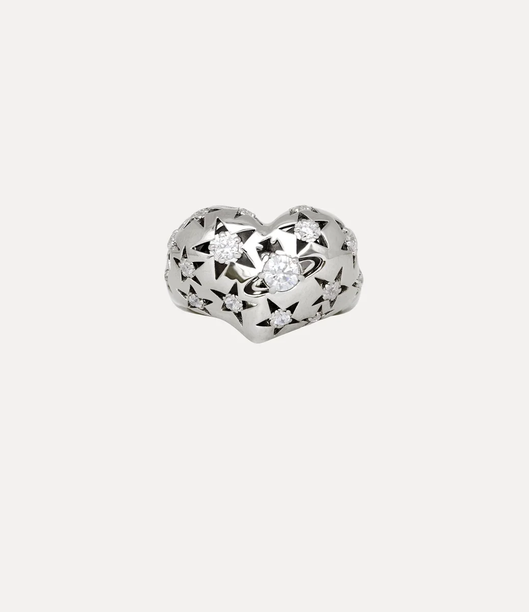 Unser Lee-Ring ist aus recyceltem Silber gefertigt und mit einer strahlenden platinfarbenen Beschichtung versehen. Die Vorderseite hat die Form eines asymmetrischen Herzens, eine Anspielung auf Viviennes Zuneigung zur Menschheit und zum Planeten, ergänzt durch mit Kristallen besetzte Sterne und Kugelmotive, die über die Oberfläche verstreut sind.