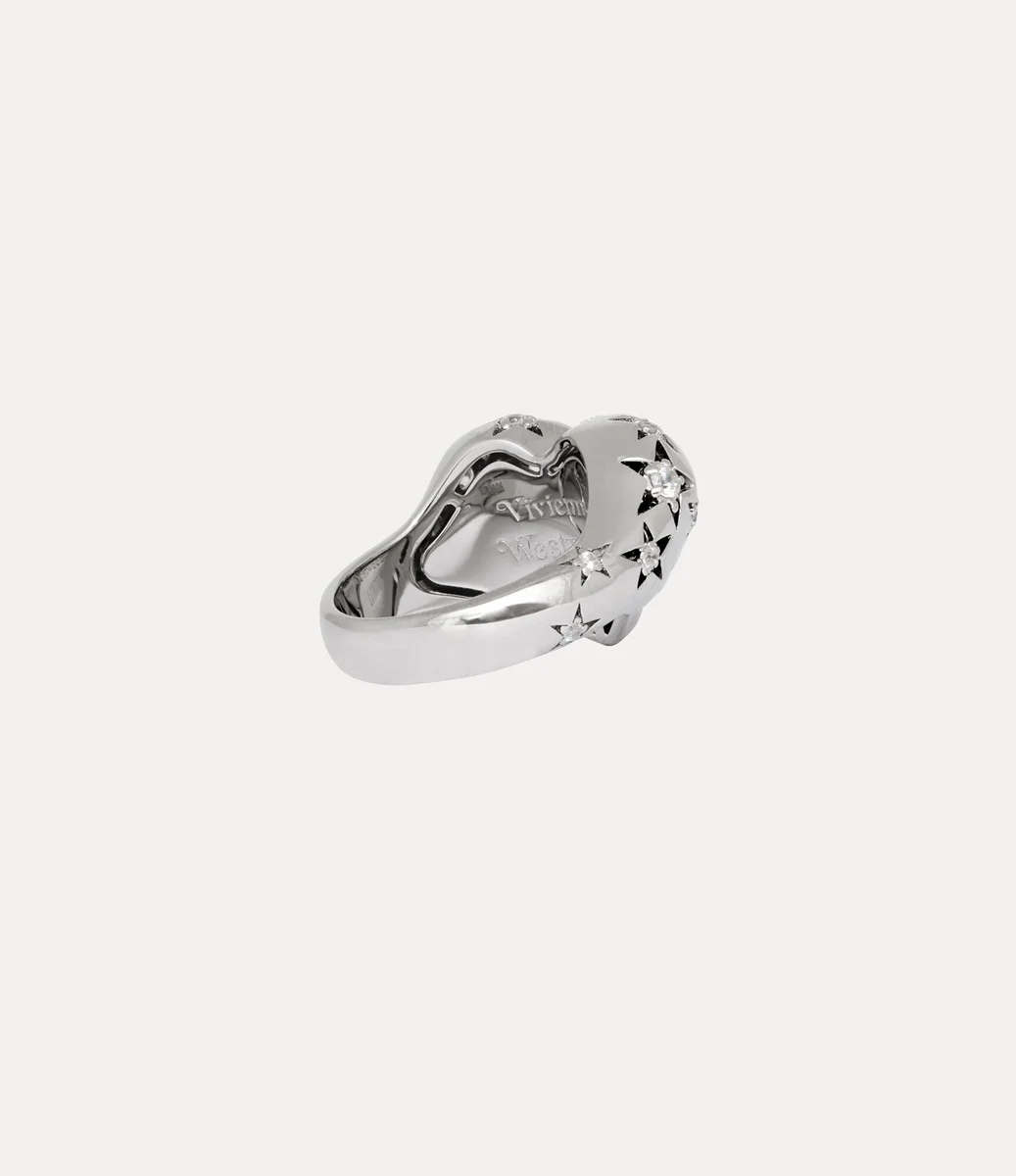 Der Vivienne Westwood Lee Ring ist aus recyceltem Silber gefertigt und mit einer strahlenden platinfarbenen Beschichtung und einer asymmetrischen herzförmigen Oberfläche versehen.