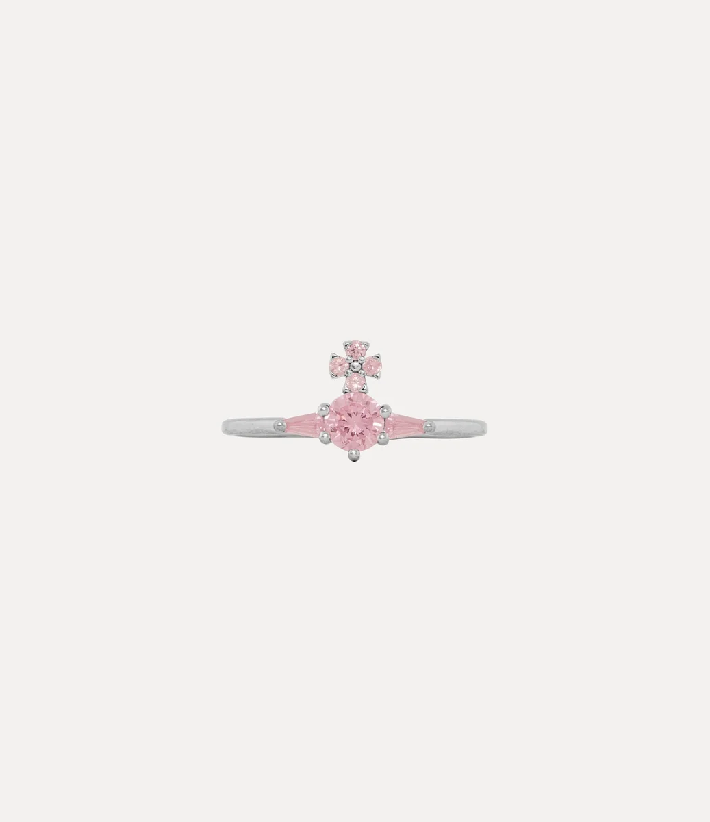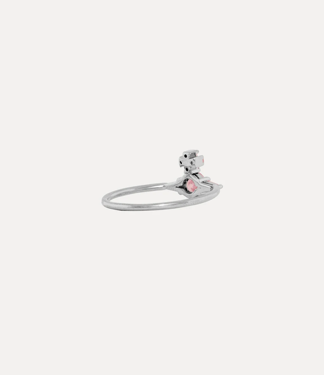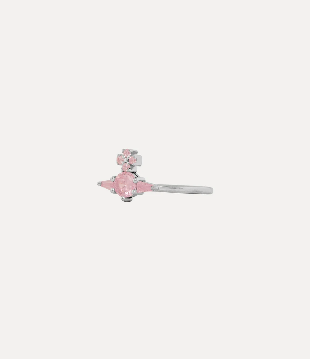 Unser Ofelia-Ring ist aus platinfarbenem Silber gefertigt und mit einem zarten Kugelmotiv verziert, das vom charakteristischen Emblem des Hauses inspiriert ist. Das Design ist mit einem rundgeschliffenen rosa Kristall besetzt, der von sich verjüngenden Baguette-Kristallen und Pavé-Details an der Kreuzspitze umrahmt wird und Viviennes Vision verkörpert, Tradition in die Zukunft zu tragen.